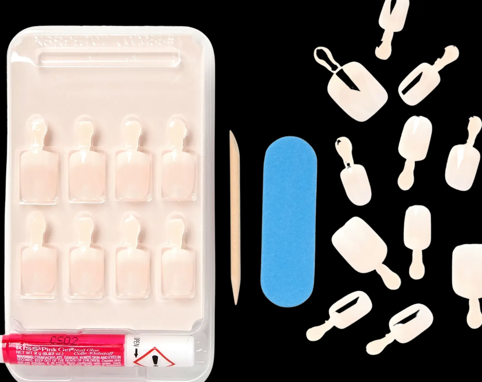 INGREDIENTS Nails: ABS plastic-Made in China. Glue: Ethyl Cyanoacrylate, Polymethyl Methacrylate, Red 7 Lake (CI15850:1)-Made in Korea
