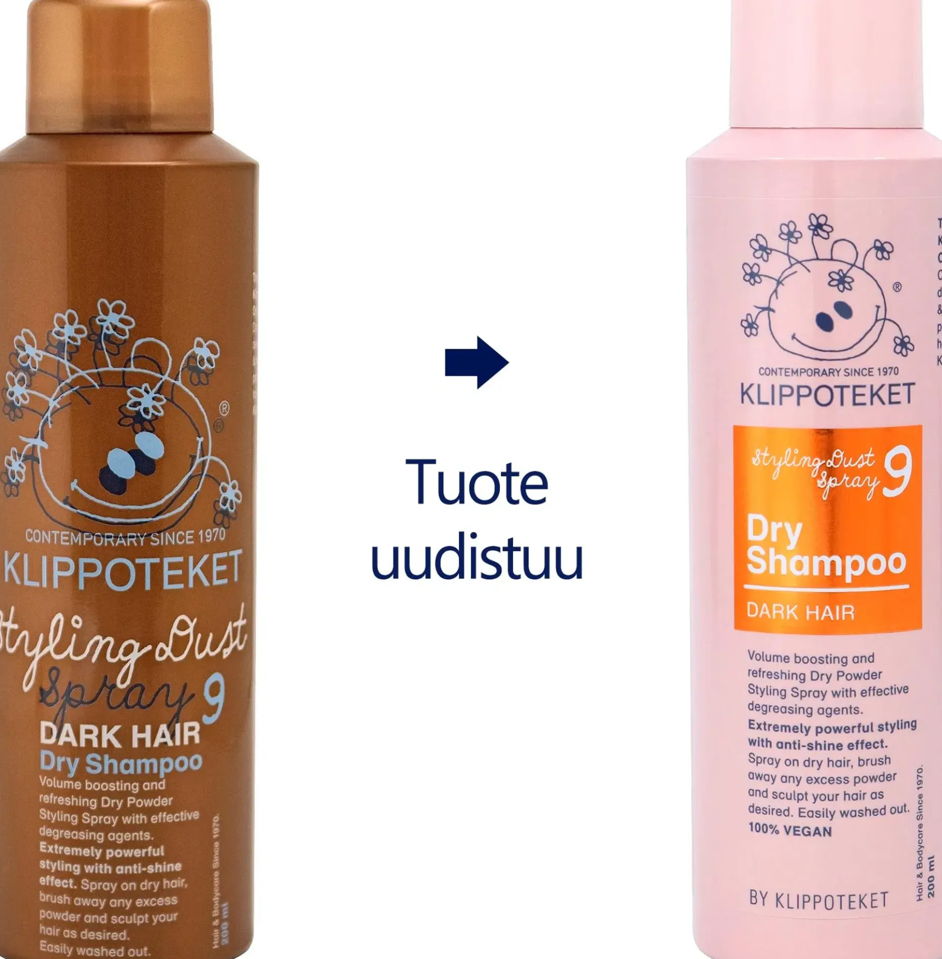 Klippoteket Styling Dust Spray kuivashampoo tummille hiuksille. Raikastaa hiukset, kun ei ole aikaa pesulle. Poistaa rasvaa, muotoilee, tuuheuttaa, sekä jätää luonnollisen mattapinnan.