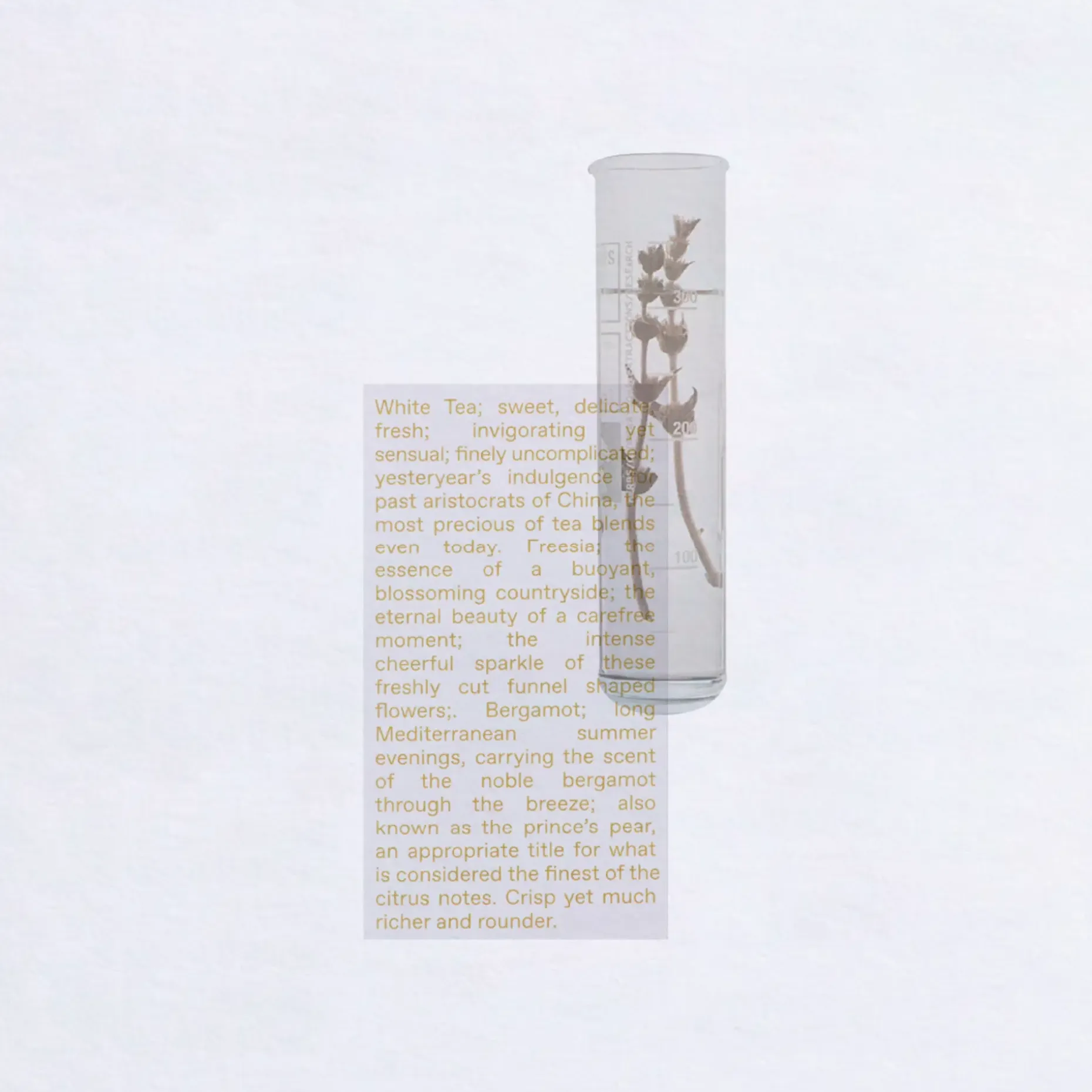 Lempeän sensuelli ja moderni yhdistelmä hienostunutta valkoista teetä ja pehmeää freesiaa, jonka kruunaavat herkullisen kupliva bergamotti ja raikas sitrus. Täyteläisen pohjatuoksun sydäntälämmittävä olemus muistuttaa pitkistä Välimeren illoista. Onnellisuutta huokuvan valovoimainen tuoksu – kuin auringonsäteet pullossa! Muinaisten kiinalaisten aristokraattien nautinto, valkoinen tee, on yksi hienostuneimmista teelaaduista. Raikkaan, herkullisen ja makeansuloisen arominsa ansiosta se on virkistävä, mutta silti aistikas sekoitus.