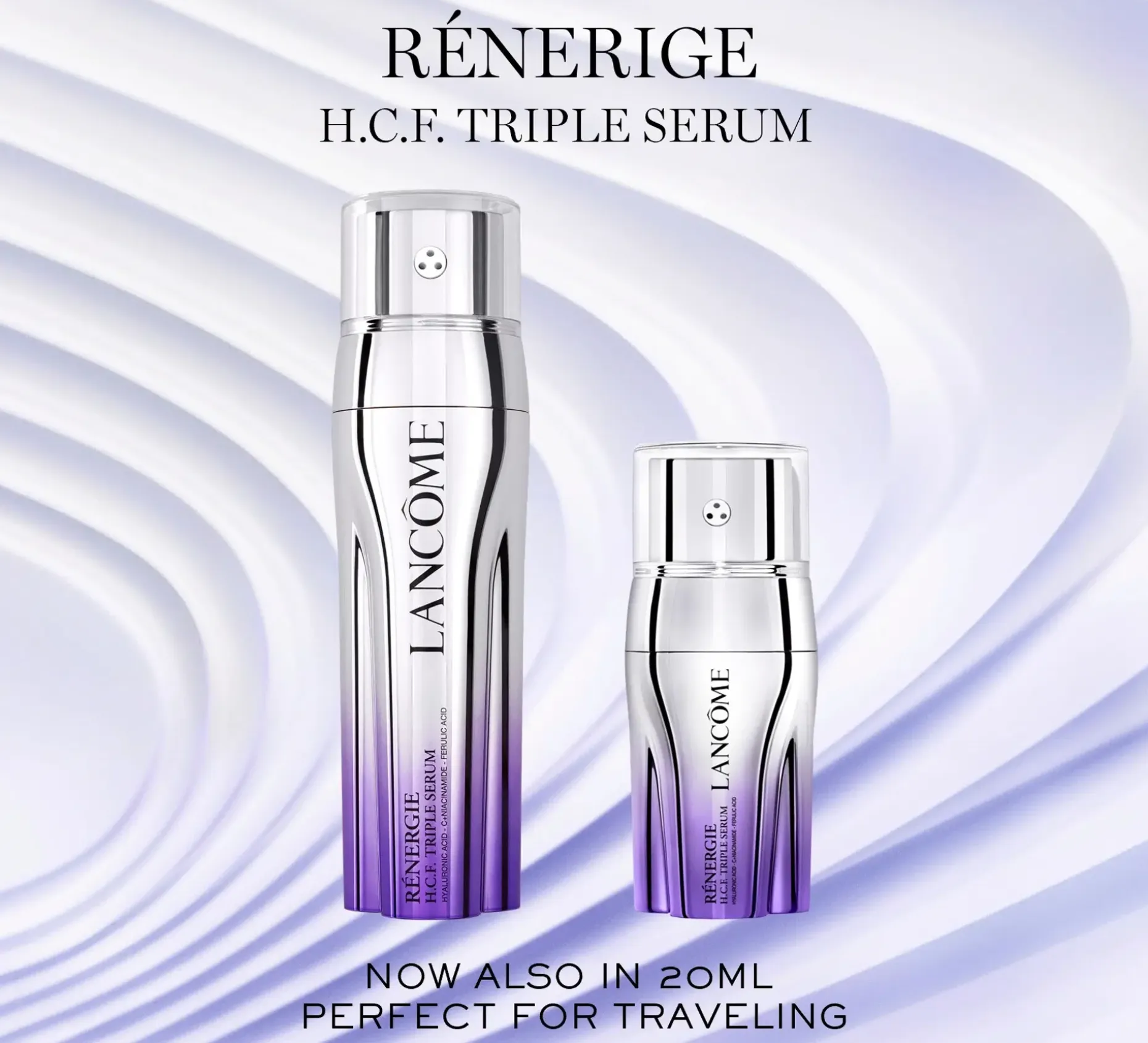 Lancômen Rénergie H.C.F. Triple Serum mullistaa anti-age-ihonhoidon. Innovatiivinen seerumi on patentoitu vuoteen 2035 asti. Sen kolme tehokasta ainesosaa yhdistyvät annokseksi: hyaluronihappo, C-vitamiini + niasiiniamidi ja ferulahappo. Nämä ainesosat toimivat täydelliseesti yhdessä iholla: Ne kosteuttavat tehokkaasti, häivyttävät näkyviä ryppyjä ja pigmenttiläiskiä ja kiinteyttävät ihoa tehden siitä nuorekkaamman näköisen.