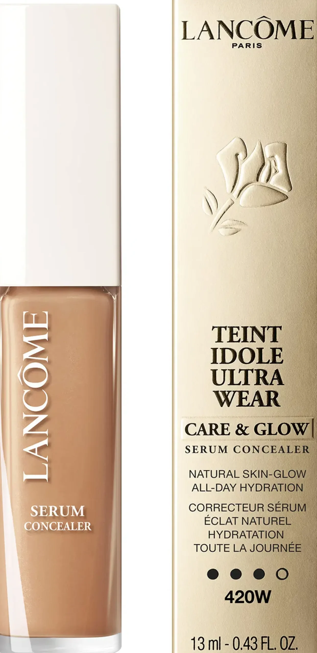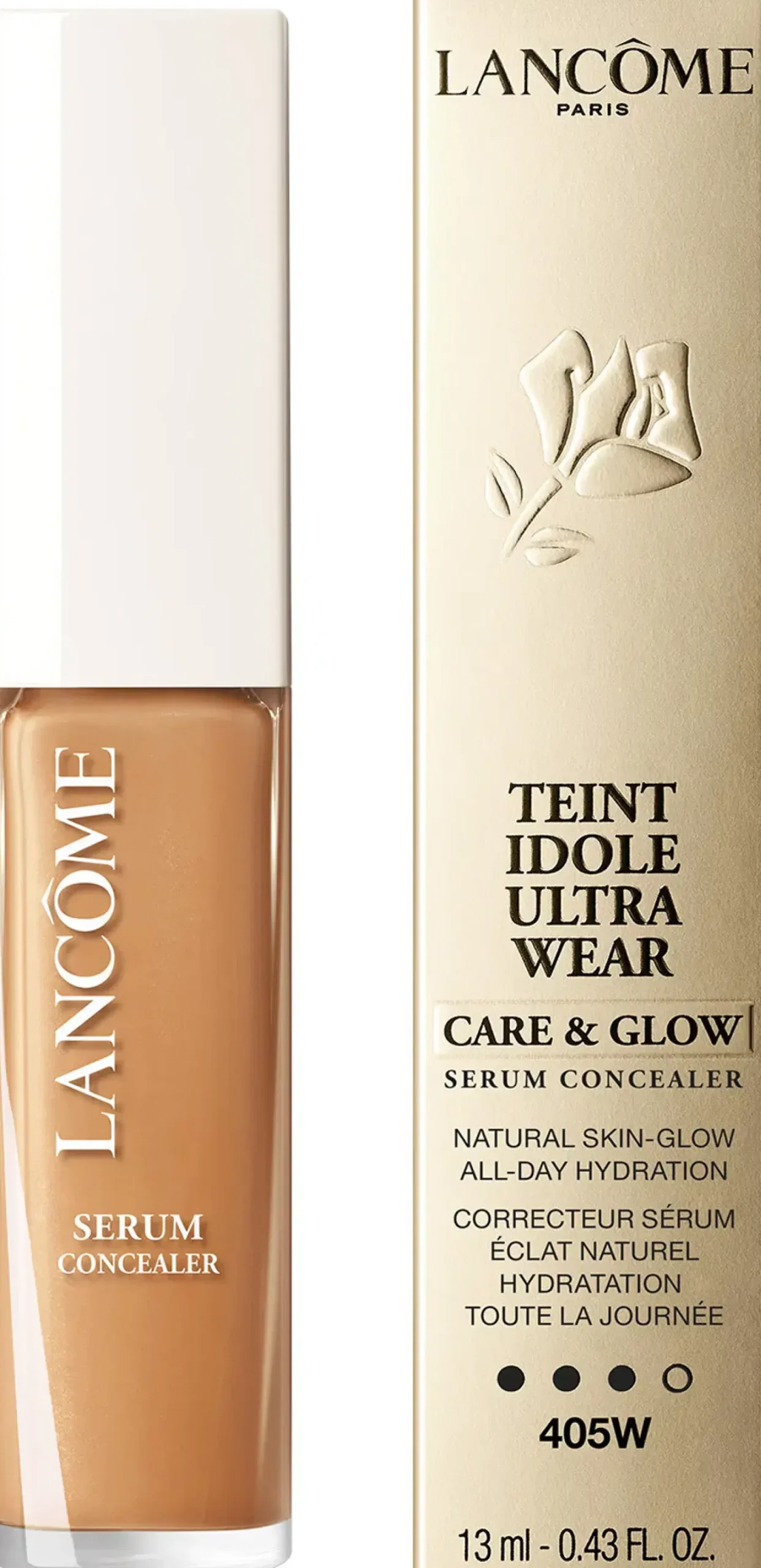 Erinomainen ihon heleyttä korostava koostumus, joka antaa ihollesi luonnollisen, 24 tuntia kestävän lopputuloksen. Teint Idole Ultra Wear Care & Glow -seerumipeiteaine kosteuttaa koko päivän ja sisältää hyaluronihappoa ja keramideja. Tämä peitevoide korostaa piirteitäsi ja vangitsee valon luonnollisesti, mutta se myös pysyy raikkaana koko päivän haalistumatta tai kertymättä ihon juonteisiin. Päivä päivältä iho näyttää heleämmältä, tasaisemmalta ja kirkkaammalta.