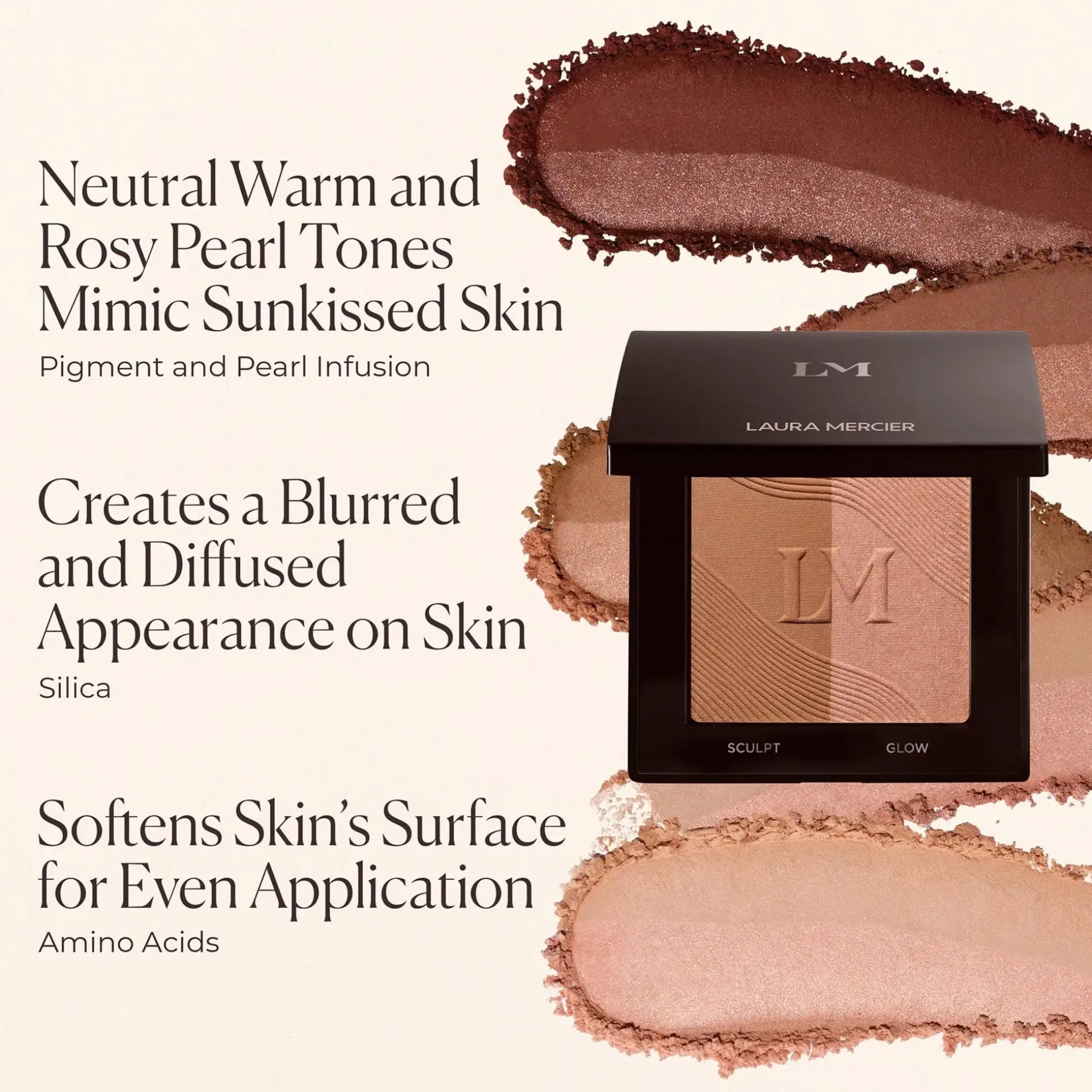 Laura Mercier Bronze Color Infusion on moniulotteinen, talkiton bronzer, jota on saatavana viitenä yksilöllisenä duona. Mattapintaisia sävyjä yhdistettynä hehkuviin ruusunpunaisiin helmiäissävyihin antaa ”Bonne Mine” Healthy Glow -hehkun, joka kestää jopa 12 tuntia. Nämä hehkuvat sävyt tarjoavat säteilevän, pehmeän värin, joka jäljittelee luonnollista punoitusta kaikilla ihonsävyillä.
