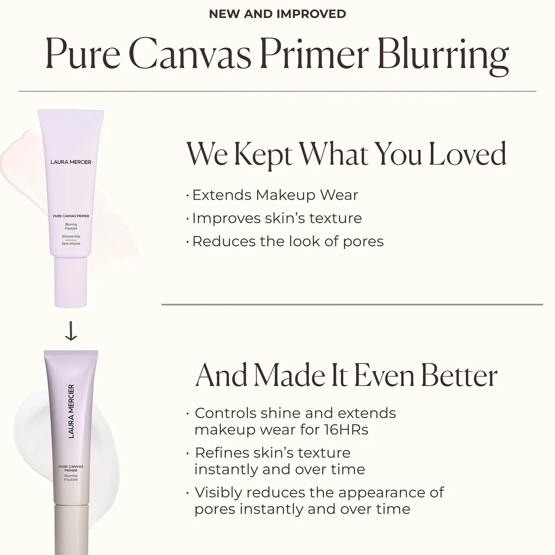 – Häivyttää ihonhuokosten näkyvyyttä ja parantaa ihoa: Vähentää näkyvästi ihohuokosten näkyvyyttä ja parantaa ihon rakennetta välittömästi ja ajan myötä.