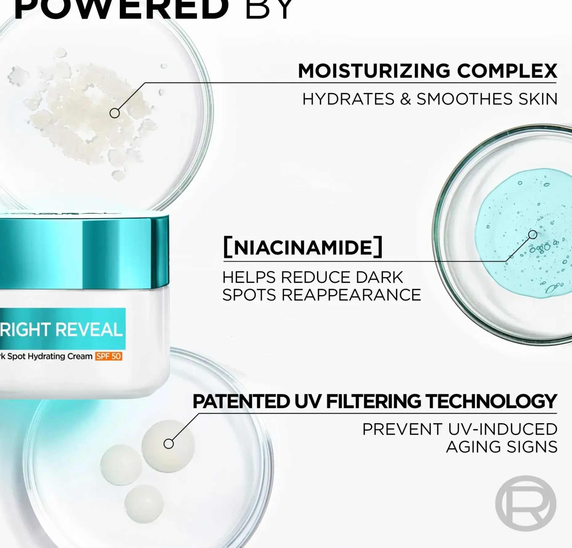 L’Oréal Paris Bright Reveal Dark Spot Hydrating on kosteuttava päivävoide, jonka koostumus sisältää UV-suodattimia, niasiiniamidia ja kosteuttavaa ainesosayhdistelmää. Jo yhden käyttökerran jälkeen iho näyttää välittömästi heleämmältä ja on täynnnä kosteutta. Kuukauden käytön jälkeen tummat läiskät ovat vähemmän näkyviä ja ihosi näyttää tasaisemmalta ja nuorekkaammalta.