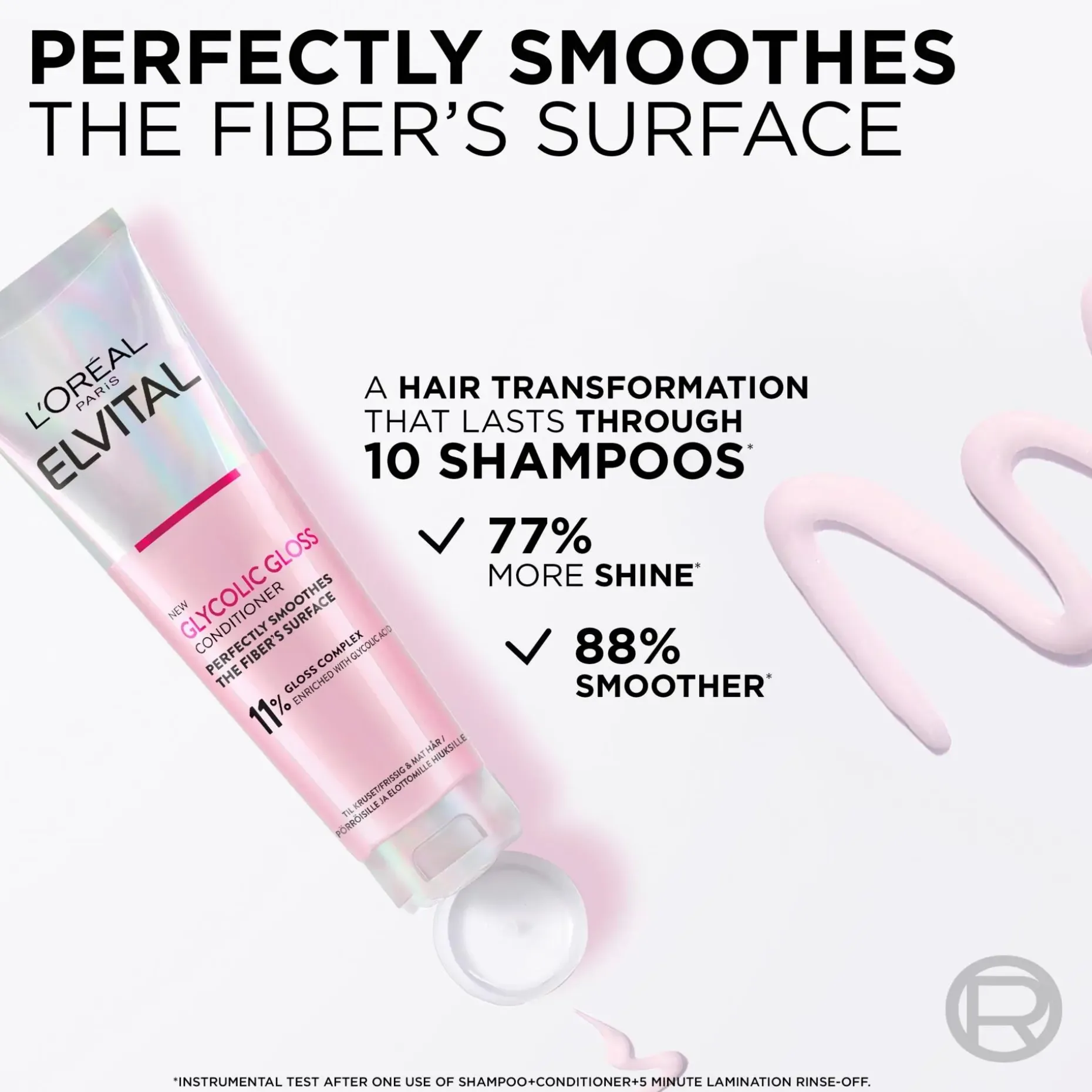 L’Oreal Paris Elvital Glycolic Gloss -hoitoaine elottomille, kiiltoa kaipaaville hiuksille silottaa hiusten pintaa. Elvital Glycolic Gloss- sarja on kiiltoa antava kotona käytettävä hiustenhoitorutiini, jonka tuotteet korjaavat hiuksia, tekevät hiusten kunnosta paremman ja antavat pitkäkestoista kiiltoa. Lopputuloksena 77% kiiltävämmät** ja 88% sileämmät*** hiukset.