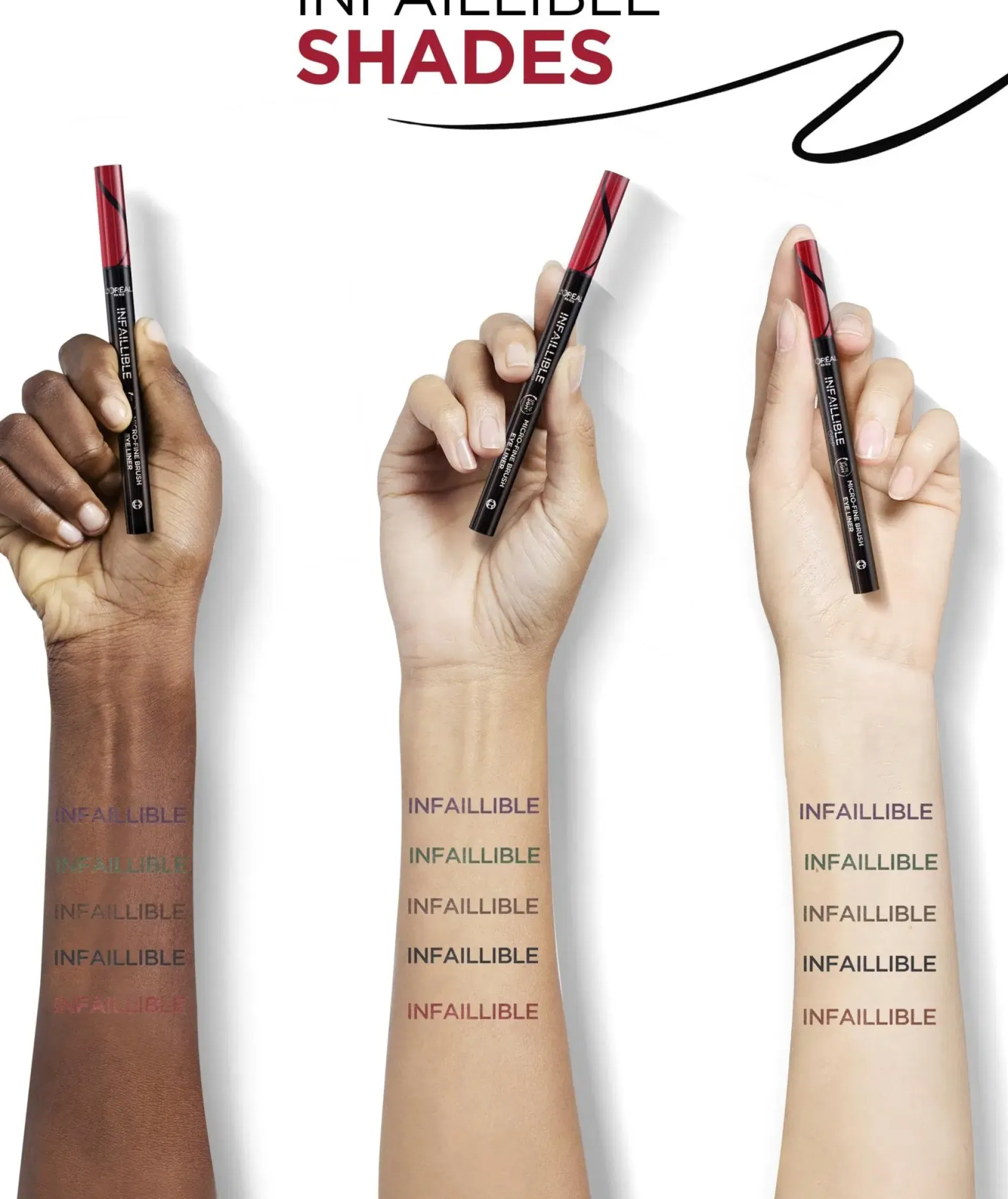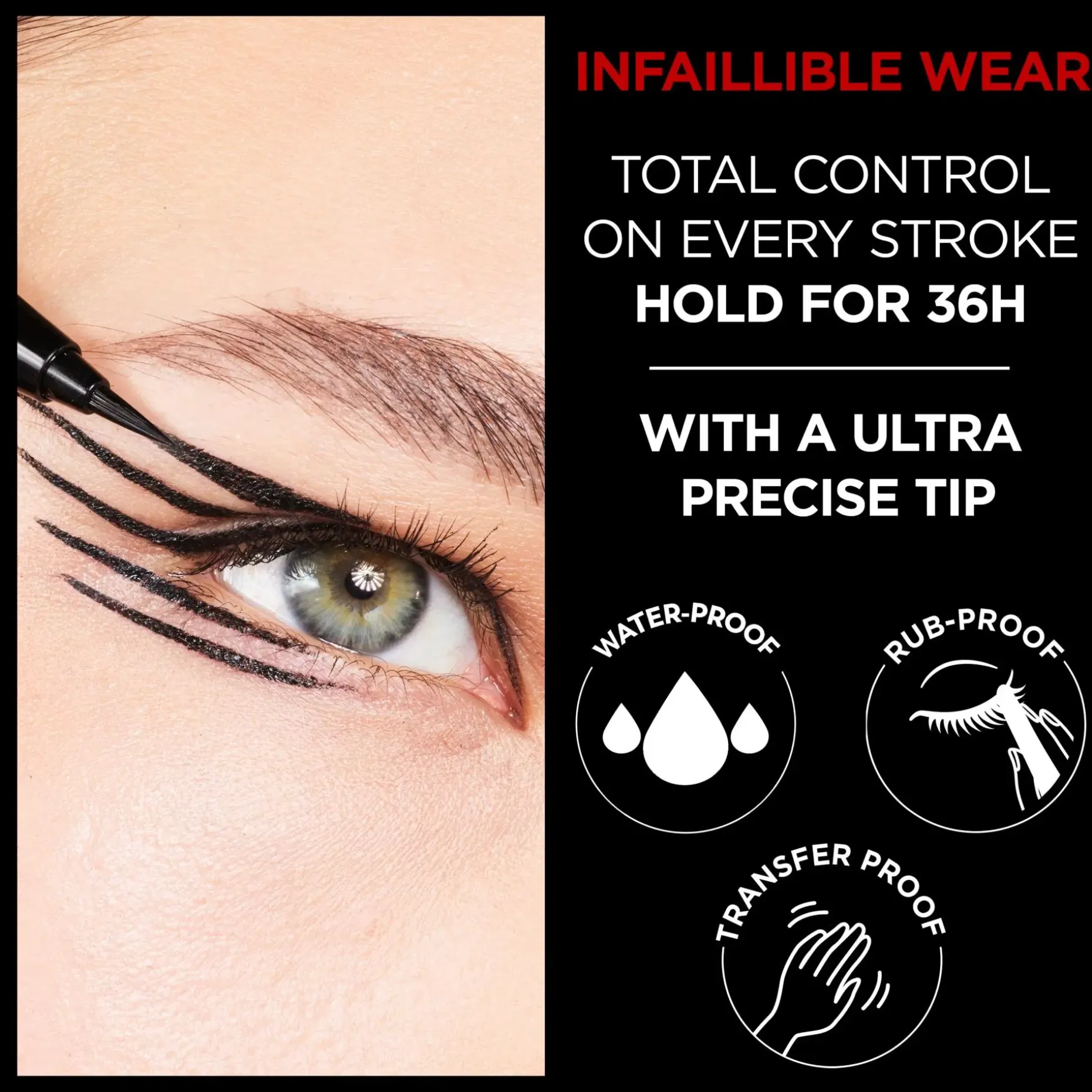 Graafiset rajaukset koko päiväksi, joka päivä! L’Oréal Paris Infaillible Grip 36H Micro-Fine -silmänrajauskynän 0,1 mm ohuen kärjen avulla voit kehystää silmät erittäin ohuilla ja tarkoilla rajauksilla. Luo kaarevia linjoja ja upeita yksityiskohtia, jotka kestävät jopa 36 tuntia*. Vedenkestävä lopputulos ei haalistu tai leviä. 36H Micro-Fine -silmänrajauskynän erityisen teknologian ansiosta voit piirtää tasaisen ja runsaspigmenttisen rajauksen.