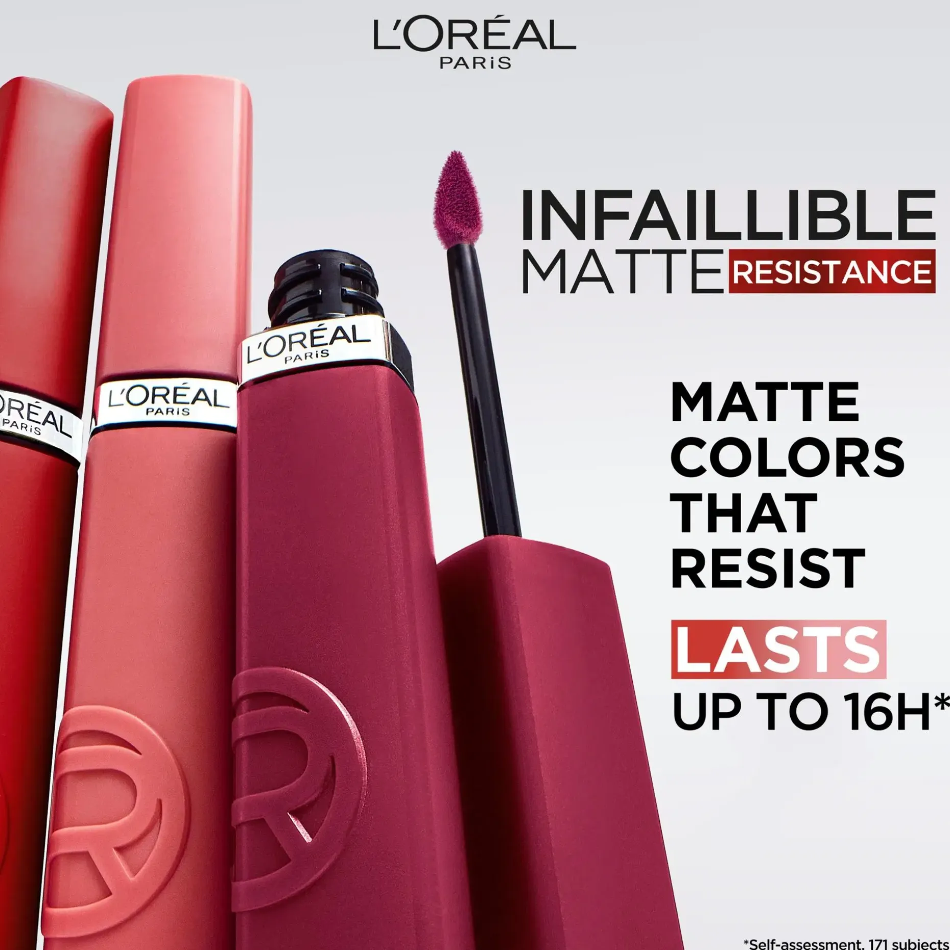 L’Oréal Paris, Infaillible Matte Resistance on pitkäkestoinen matta, nestemäinen intensiivisen värin antava huulipuna, joka kestää jopa 16 tuntia*. Matta hyaluronihappoa sisältävä kevyt koostumus levittyy helposti. Hienkestävä huulipuna ei tahraa eikä leviä ja kestää koko päivän.