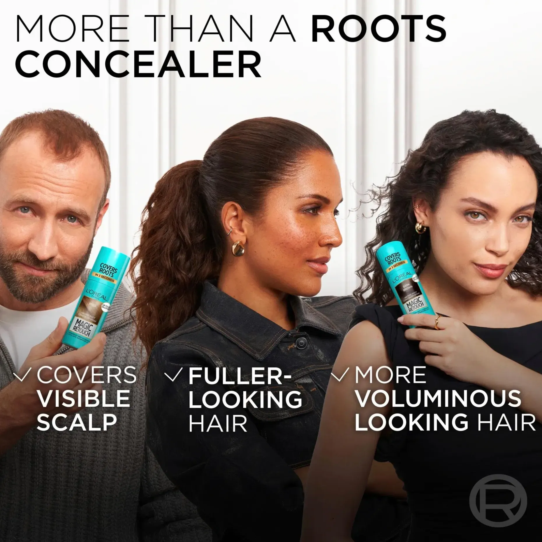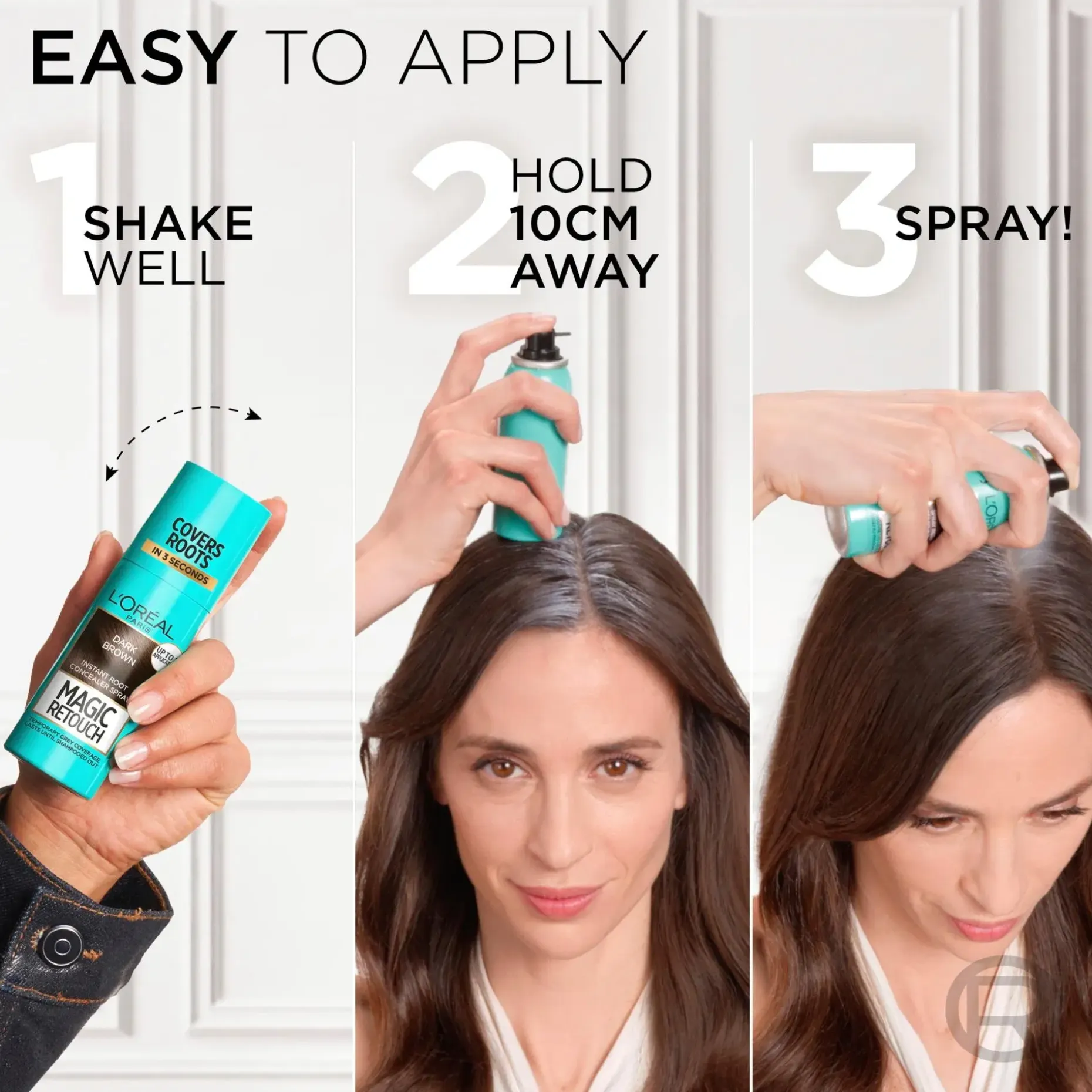 Värisuihke, joka peittää juurikasvun ja harmaat hiukset välittömästi. Magic Retouch on helppo pestä pois shampoolla ja peittää harmaat väliaikaisesti. Vaikutus säilyy hiuksissa shampoopesuun asti. Värisuihke sulautuu hiustesi sävyyn täydellisesti ja kuivuu nopeasti. Väri ei tartu hiuksista muualle. 1. Ravista suihketta. 2. Suihkuta hiusten tyveen 10 cm etäisyydeltä. 3. Juurikasvu on poissa!