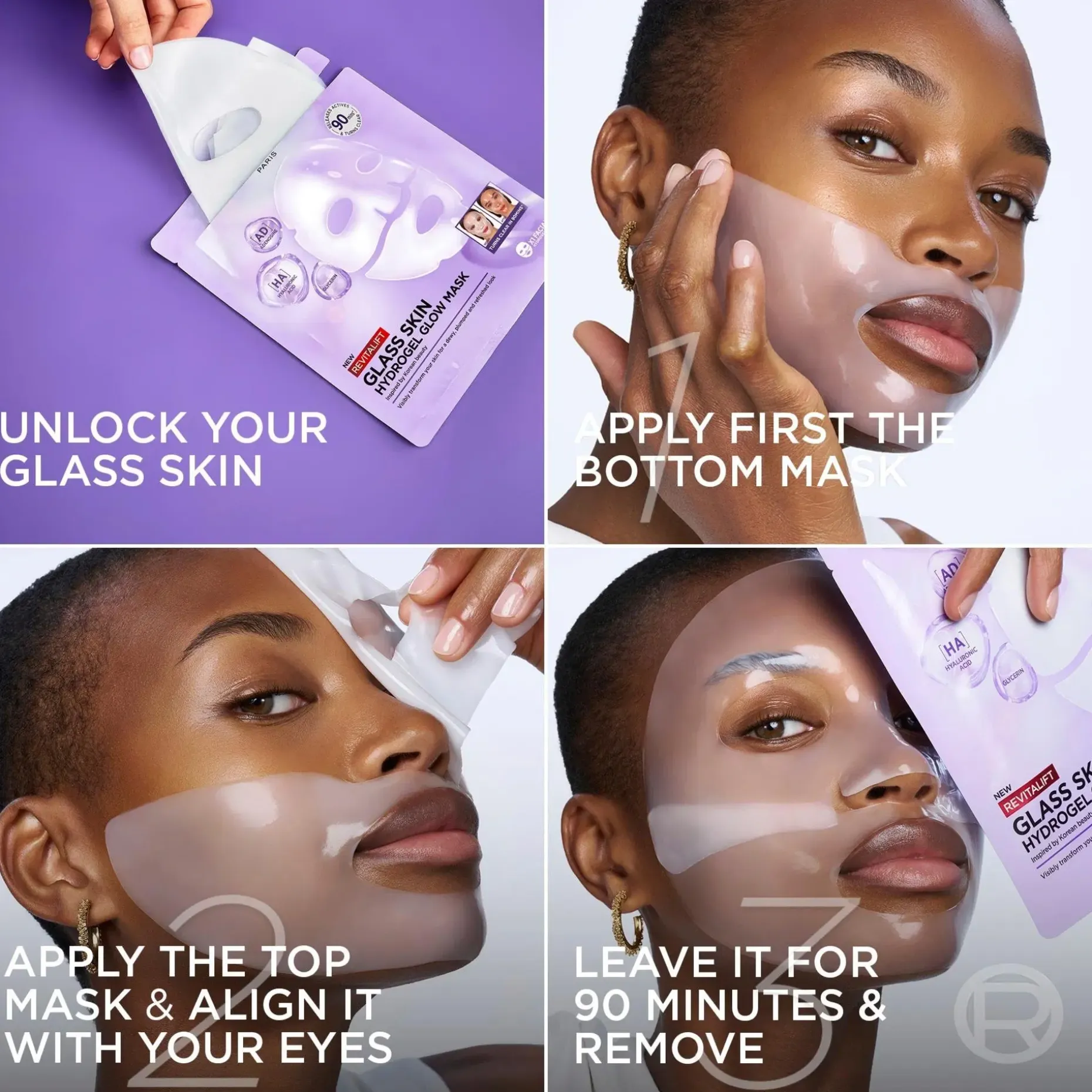 1. Avaa pakkaus. Levitä puhdistetulle ja kuivalle iholle. Asettele ensin alaosa suun ympärille. 2. Asettele sen jälkeen yläosa silmänympärysalueelle. 3. Anna vaikuttaa 90 minuuttia, kunnes naamiosta tulee läpinäkyvä. Poista sitten naamio varovasti.