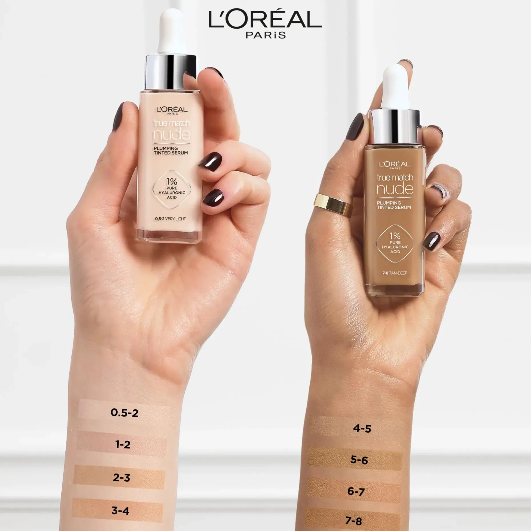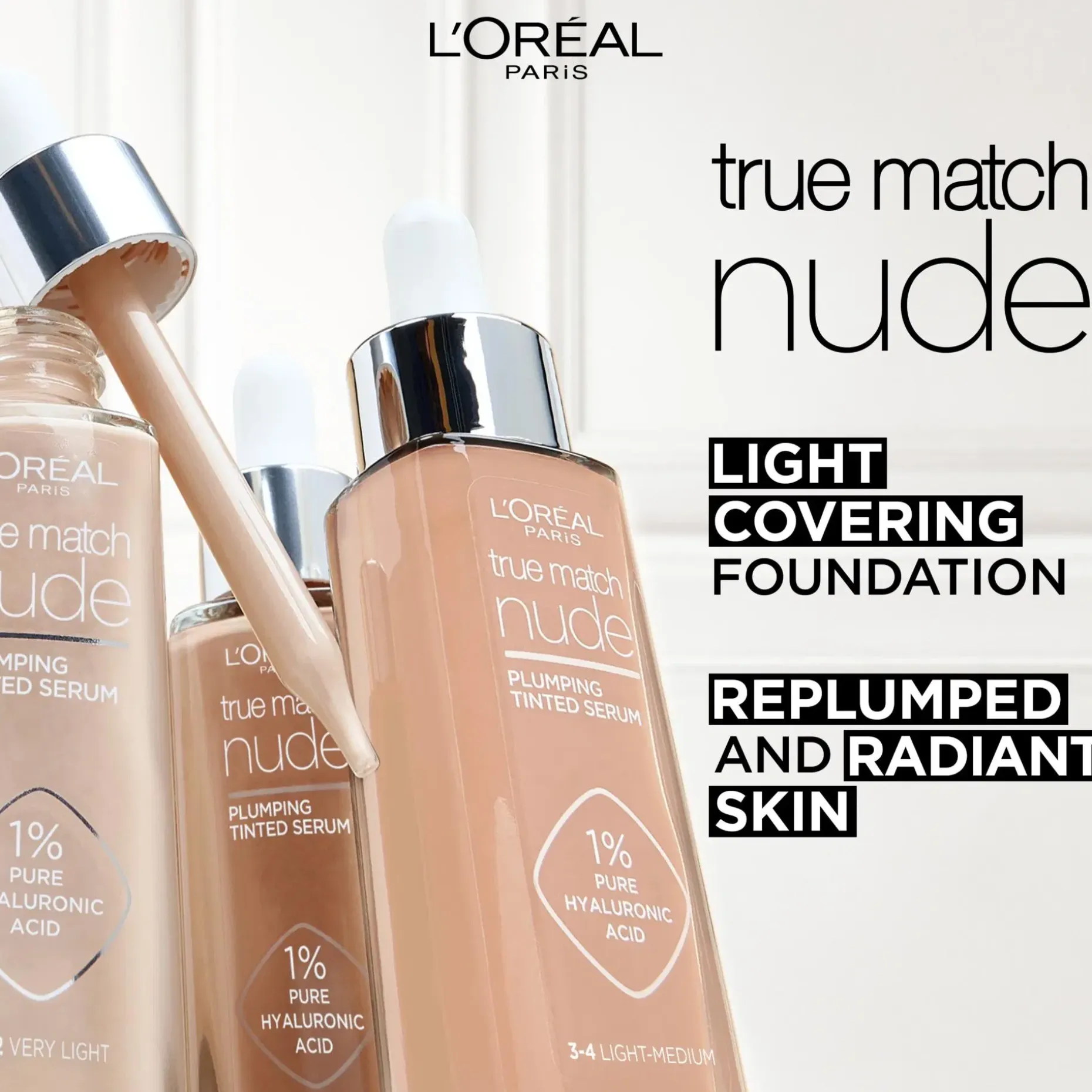 True Match Nude Plumping Tinted Serum -meikkivoiteen helposti häivytettävät sävyt sulautuvat saumattomasti moniin erilaisiin ihon sävyihin. Sävyttävä seerumi, jonka koostumus sisältää 1% hyaluronihappoa, antaa täyteläisen ja sileän näköisen ihon sekä luonnollisen näköisen peittävyyden ja nuden lookin.