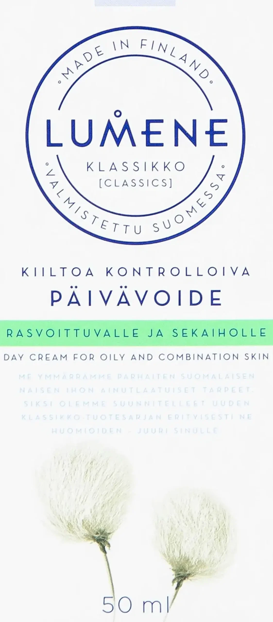 – Rasvoittuvalle ja sekaiholle tarkoitettu Klassikko Kiiltoa kontrolloiva päivävoide kosteuttaa tehokkaasti, jättää ihon mattapintaiseksi ja pienentää ihohuokosia. Ainutlaatuinen yhdistelmä, joka sisältää pohjoista tupasvillaa ja puhdasta pohjoista lähdevettä, kosteuttaa, suojaa ja ravitsee ihoa saaden sen näyttämään kauniilta ja hyvinvoivalta. Formuloitu ilman mineraaliöljyä, parabeeneja ja formaldehydin vapauttajia.