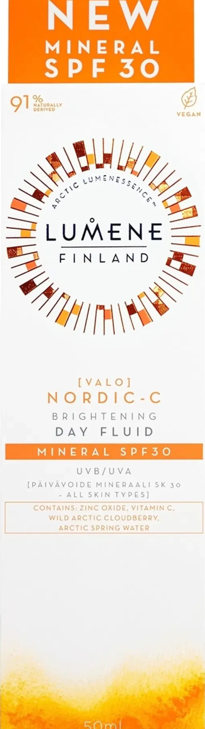 LUMENE Nordic-C [Valo] Kirkastava päivävoide mineraali SK30 on kevyen tuntuinen kosteusvoide, joka kirkastaa ihoa jättäen sen heleän säteileväksi sekä antaa päivittäisen luonnollisen mineraaliaurinkosuojan UVA/UVB-säteitä vastaan (SK30). Sisältää C-vitamiinipitoista pohjoisen lakkaa sekä innovatiivista sinkkioksidia, joka ei sisällä nanopartikkeleita. Levittyy helposti ilman tahmeaa tunnetta ja sopii kaikille ihotyypeille. Vegaaninen koostumus sisältää sivuvirroista saatavia ja luonnosta käsin poimittuja raaka-aineita. Pakkauksessa on käytetty kierrätettäviä ja kierrätettyjä materiaaleja.