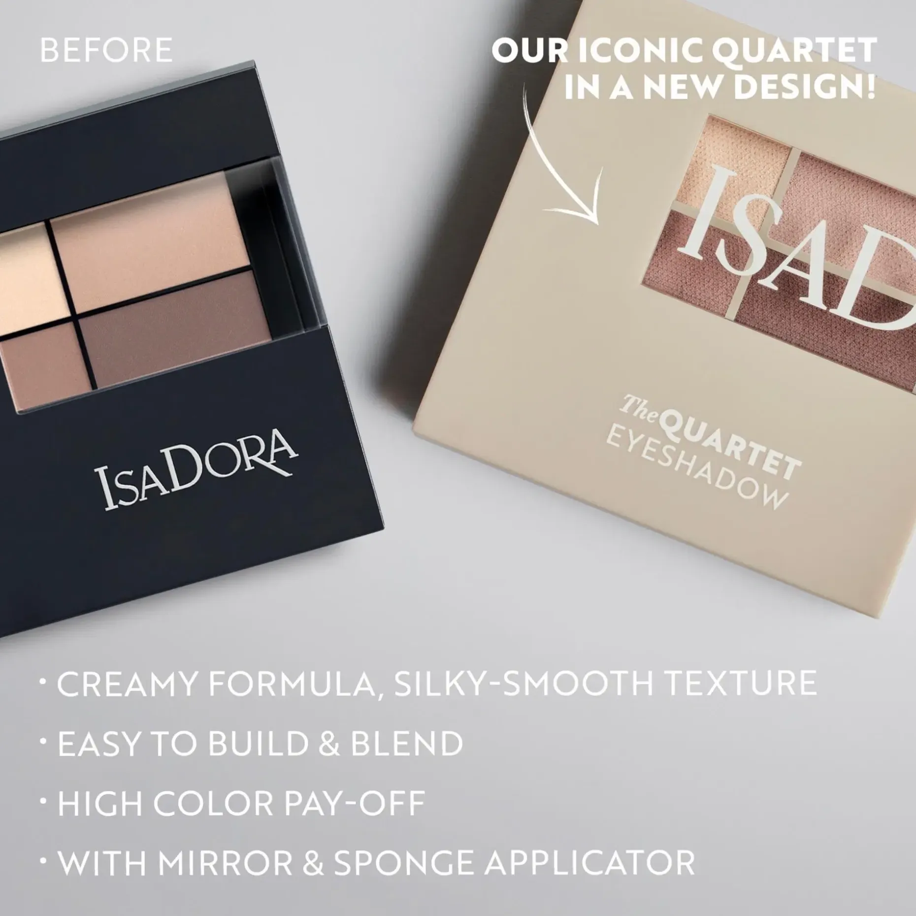 Eyeshadow Quartet -paletit koostuvat neljästä yhteensopivasta sävystä, joita on saatavilla runsaspigmenttisinä ja sekä mattapintaisina että kimmeltävinä. Vapauta luovuutesi ja luo erilaisia tyylejä. Voidemainen koostumus on runsaspigmenttinen ja silkkisen pehmeä, mikä tekee kerrostamisesta ja häivyttämisestä helppoa ja mahdollistaa saumattoman, luonnollisen tai näyttävän silmämeikin.