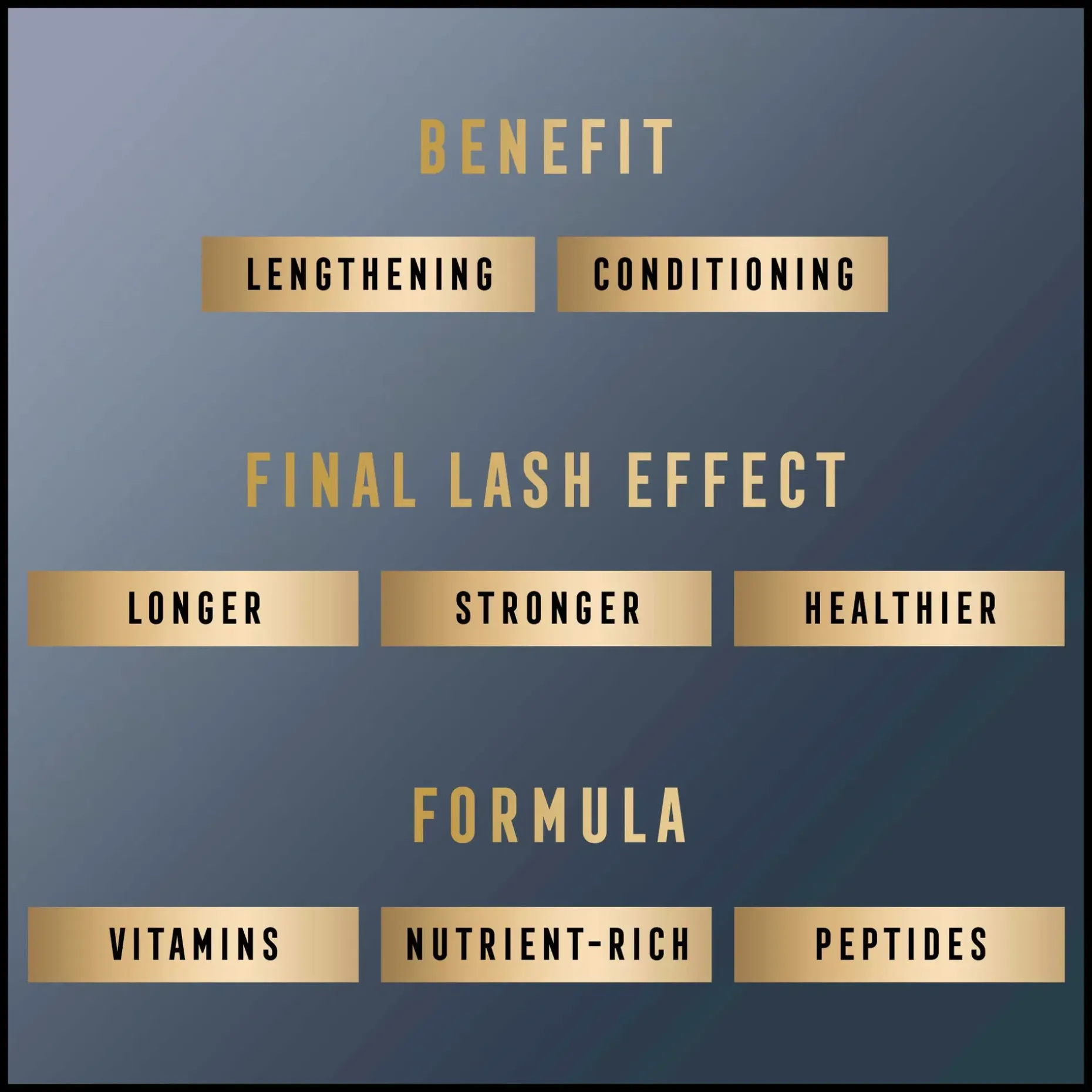 Ravintorikas vitamiiniyhdiste, proteiinit ja peptidit; tämä ultrahoitava tiiviste stimuloi luonnollista ripsien kasvua ja ehkäisee niiden katkeilua.
