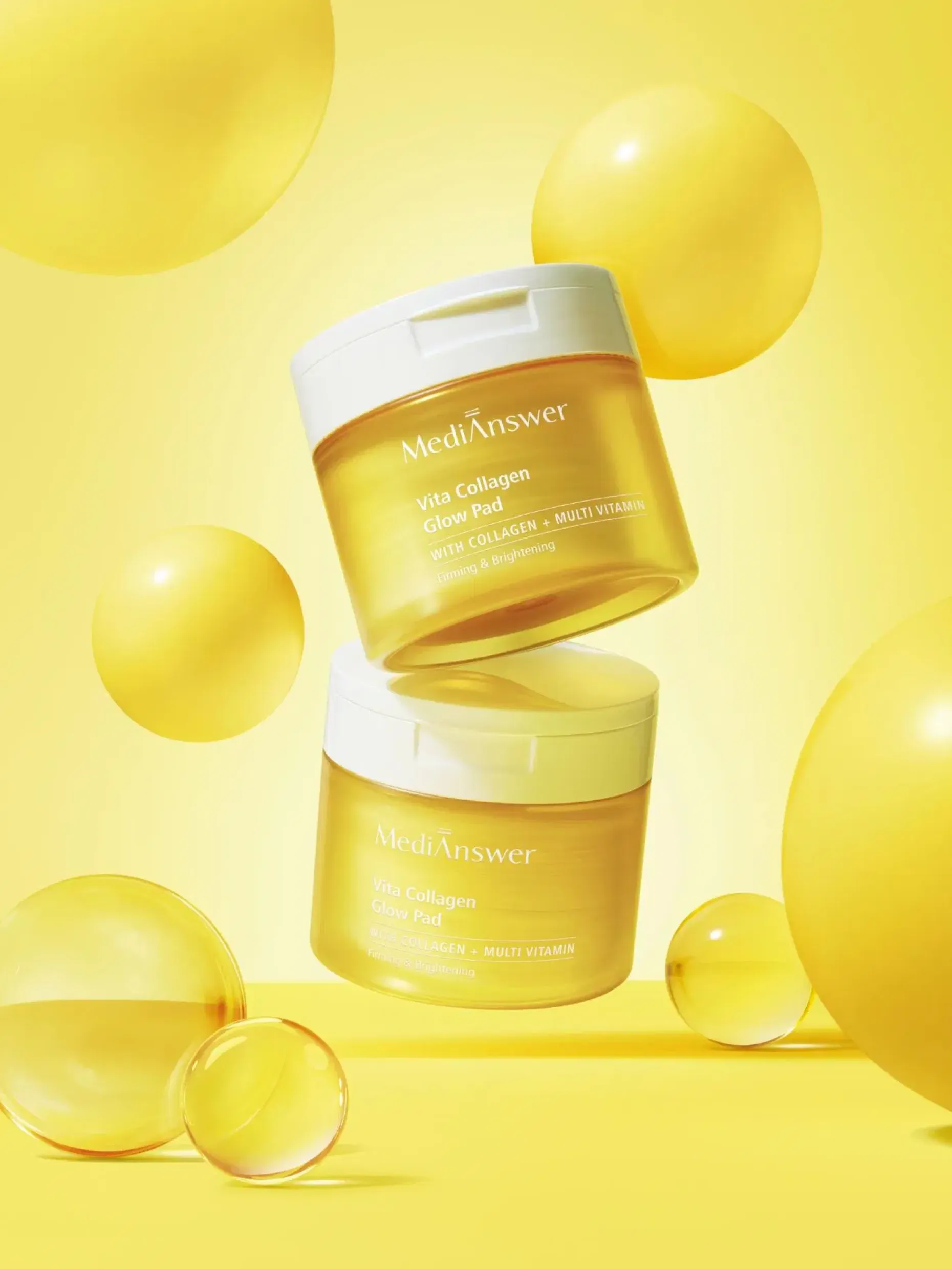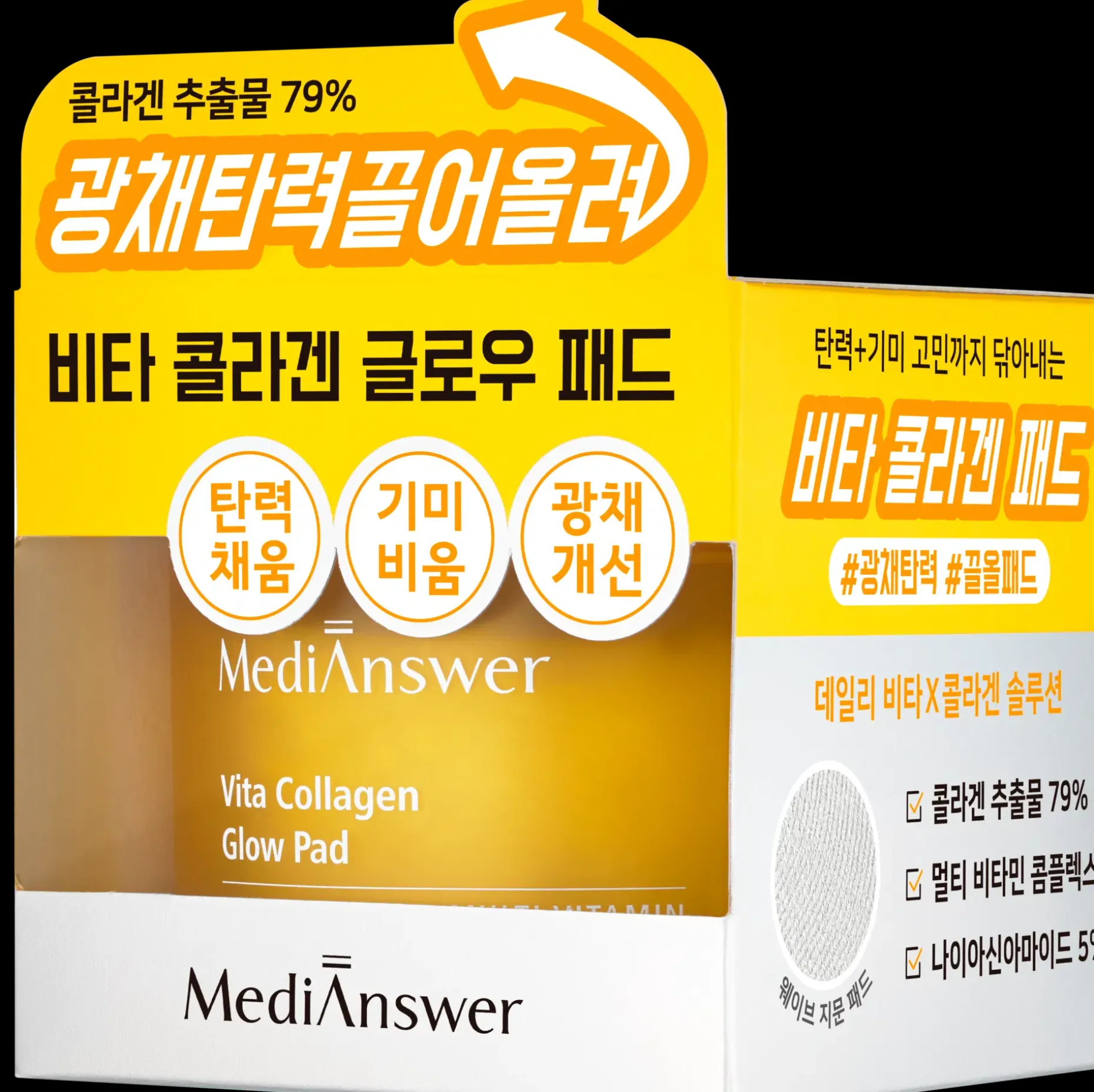 Vita Collagen Glow Pad on ”kollageenin mestariksi” nimitetyn MediAnswer -brändin tehokkaasti kirkastava ja ihon elastisuutta, sekä tekstuuria edistävä kasvovesilappu (toner pad) etenkin ikääntyvälle- ja samealle iholle.