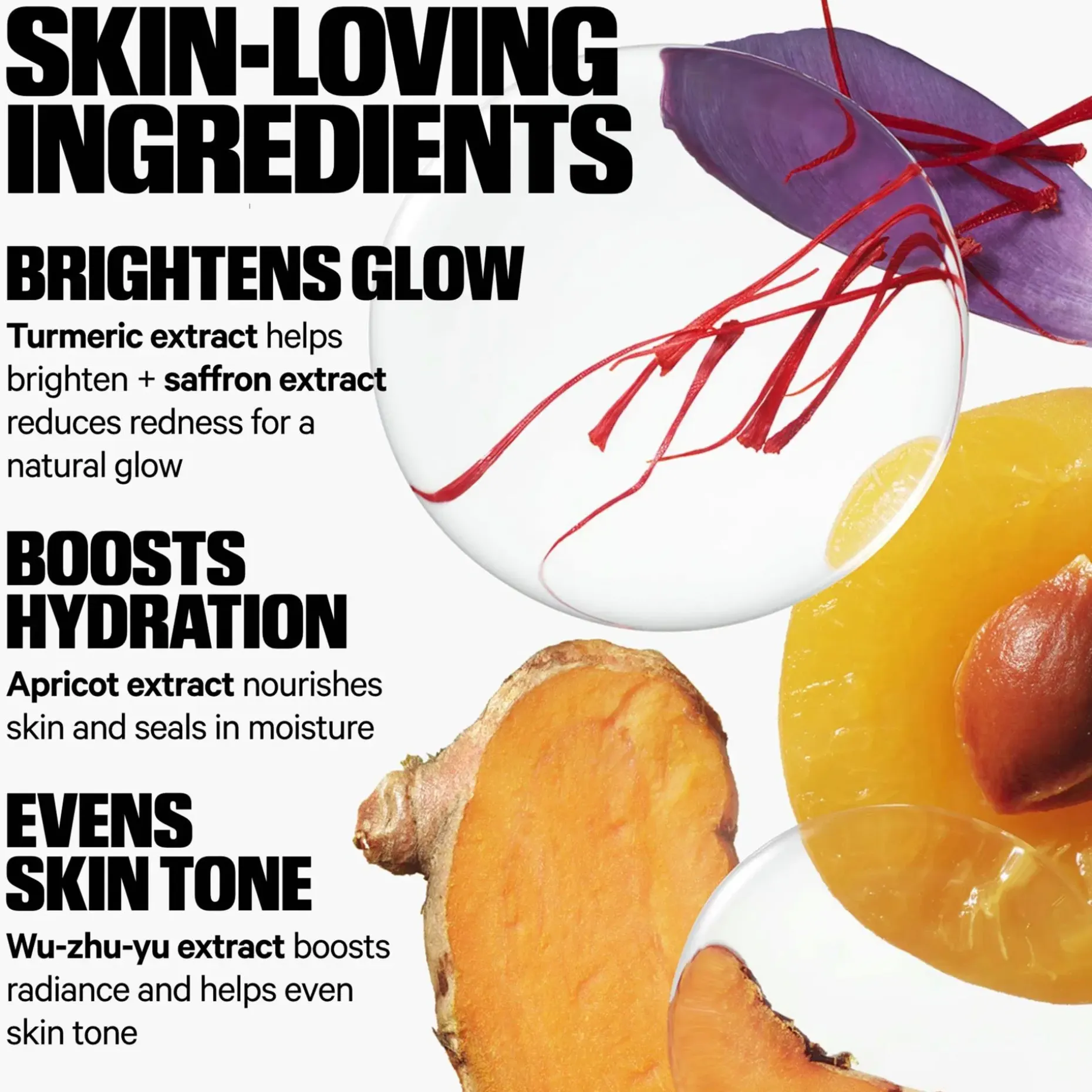 Aqua/water/eau, Propanediol ,Glycolipids ,Curcuma longa (turmeric) root extract,Crocus sativus flower extract, Evodia Rutaecarpa fruit extract,Prunus Armeniaca (apricot) fruit extract, Sodium Cocoyl Glycinate, Maltooligosyl glucoside, Hydrogenated Starch Hydrolysate, Diethylhexyl Syringylidenemalonate, Glycerin ,Caprylic/Capric Triglyceride, Lactic acid, Citric acid, Phenoxyethanol, Potassium Sorbate, Dehydroacetic Acid, Benzyl alcohol, Sodium Benzoate,Red 4 (CI 14700)