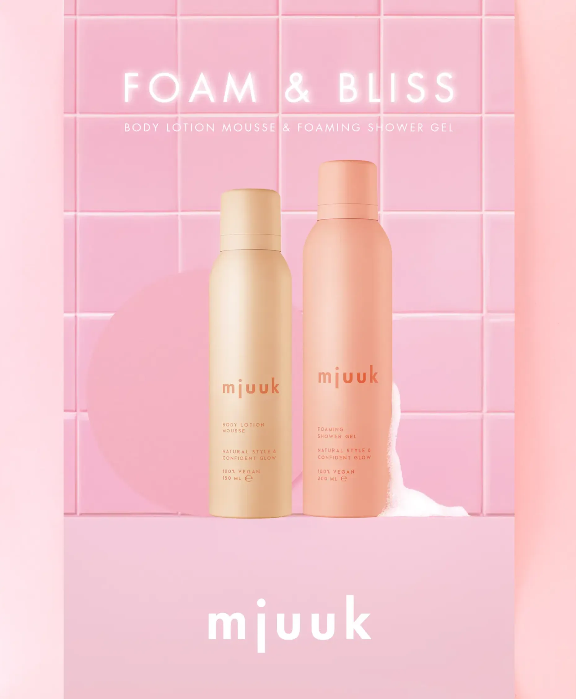 Pakkaus sisältää Mjuukin vartalovoidemoussen 150 ml ja vaahtoavan suihkugeelin 200 ml. Luonnollinen tyyli ja itsevarma hehku. 100 % vegaaninen.