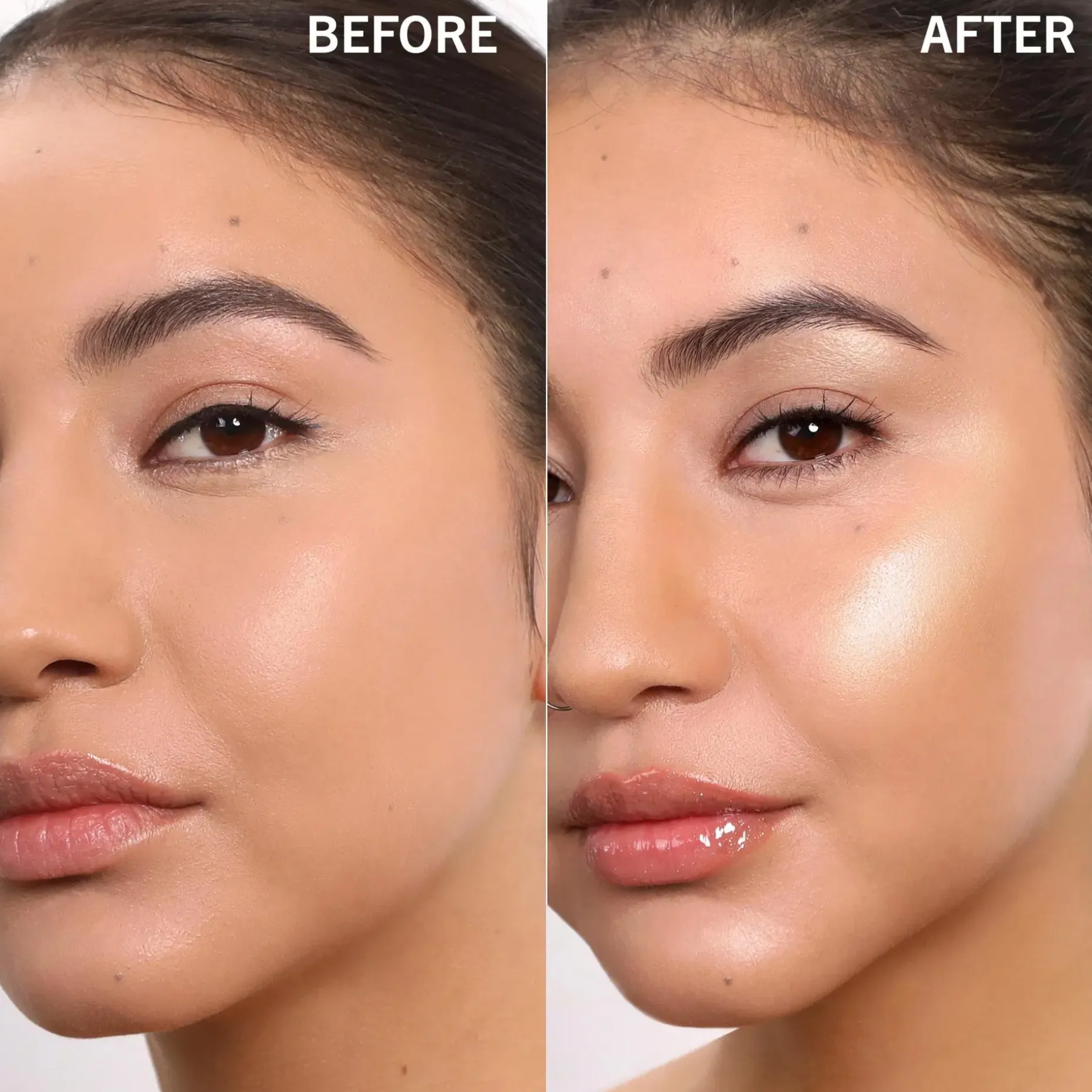 Korostustuotteena: Meikkaa tavalliseen tapaan. Lisää pieni määrä Glow Show Liquid Highlighteria halutuille alueille; tyypillisesti poskipäille, nenän varteen ja päähän, silmien sisänurkkiin ja amorin kaarelle. Häivyttele sormella.