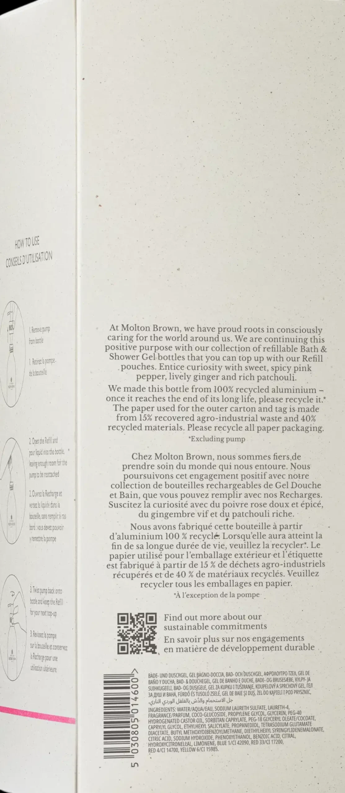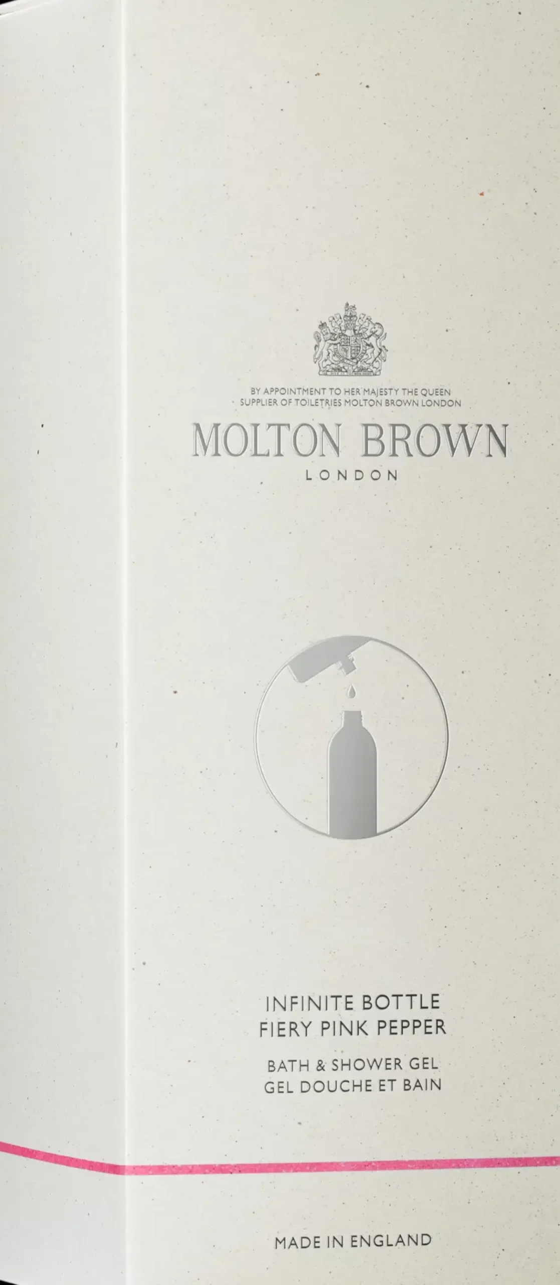 Molton Brown Infinite Bottle Fiery Pink Pepper on ihanan mausteinen suihkusaippua vastuullisessa uudelleentäytettävässä pullossa, joka on valmistettu 100 % kierrätetystä alumiinista. Mausteisen roseepippurin, eloisan inkiväärin ja täyteläisen patsulin eloisia nuotteja sisältävä aistillinen suihkusaippua antaa kylpy- ja suihkurituaalillesi ripauksen ylellisyyttä, puhdistaa ihoa ja antaa sille ihanan tuoksun. Käytä yhdessä yhteensopivan Molton Brown -vartaloemulsion kanssa viimeistelläksesi tuoksuelämyksen.