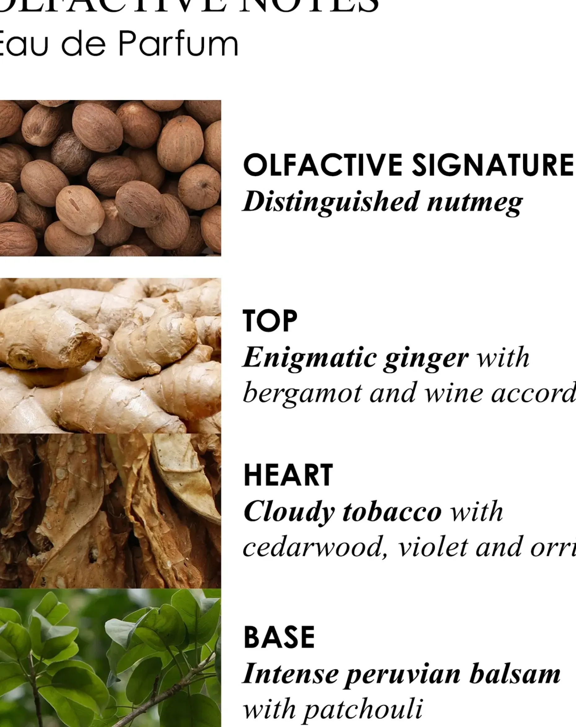 Molton Brown Tobacco Absolute EdP on puuvivahteinen tuoksu, joka herättää aistit voimakkaan inkiväärin, savuisen tupakan ja aistillisen perulaisen balsamin monisävyisillä, ajattomilla nuoteilla. Ilahduttavaa lasipulloa koristaa ainutlaatuinen pyöreä korkki.