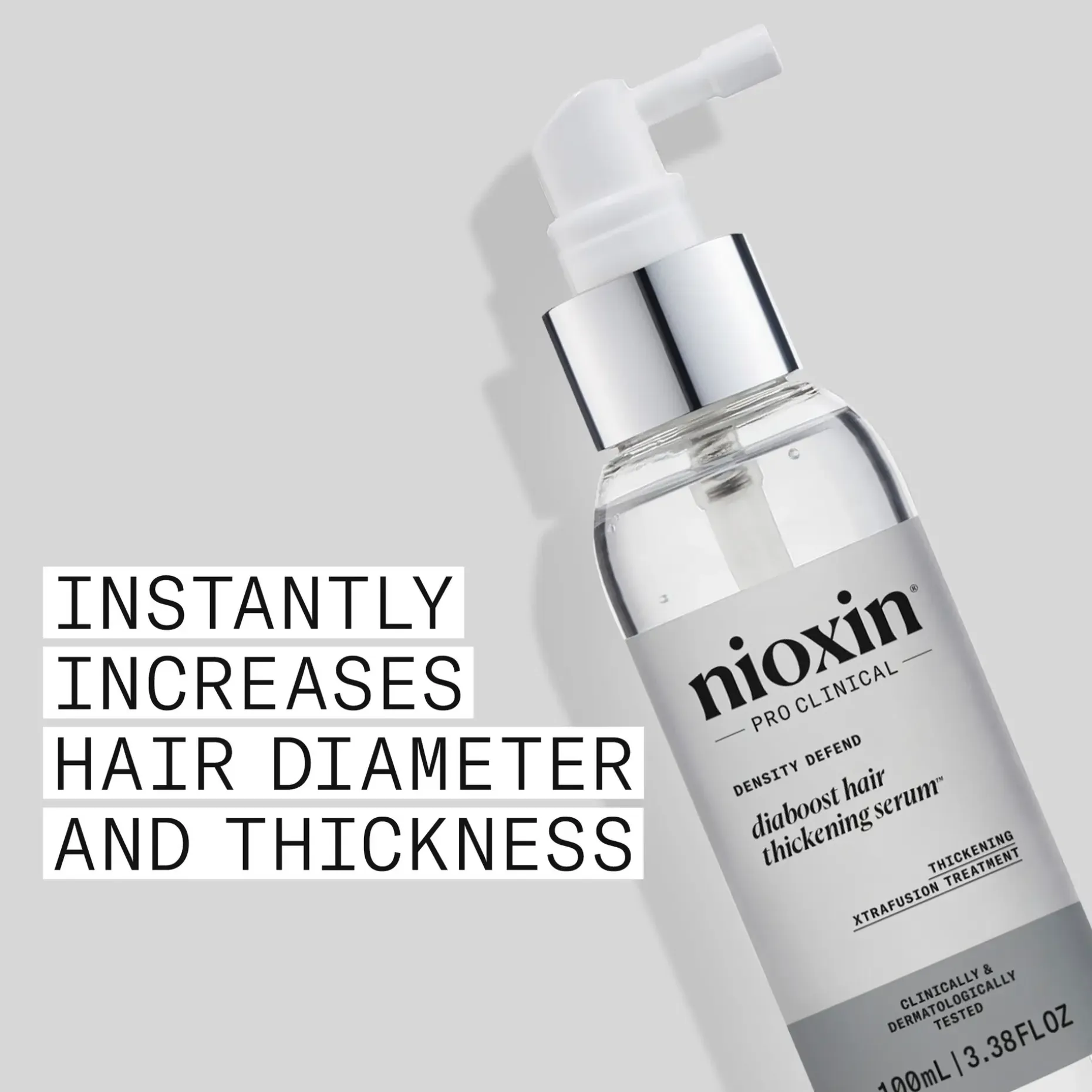 Nioxin Diaboost on hiuksiin jätettävä hoito ohuille hiuksille, joka kasvattaa jokaisen hiussuortuvan paksuutta ja tekee hiuksista tuuheamman näköiset. Korjaava seerumi tekee hiuksista paksummat jo yhden käyttökerran jälkeen ja tekee hiuksista helpommin käsiteltävät. Sisältää HTX-teknologian, jonka sisältämät ainesosat, kuten kofeiini, niasiiniamidi ja pantenoli, tekee hiuksista paksummat, vastustuskykyisemmät ja suojaa niitä katkeilulta.