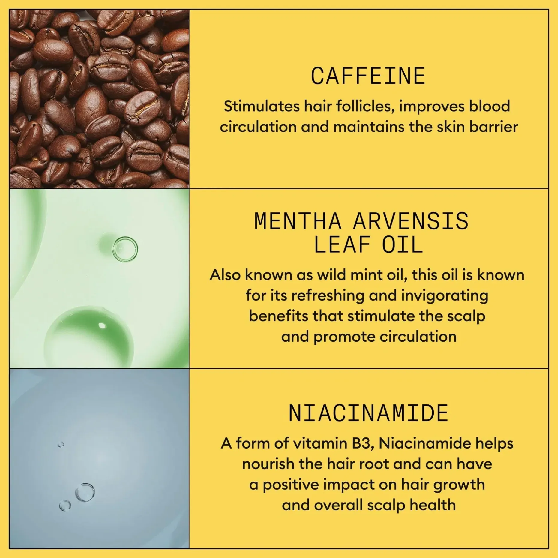 Aqua/Water/Eau, Niacinamide, Caffeine, Phenoxyethanol, Sodium Benzoate, Benzyl Alcohol, Acrylates/C10-30 Alkyl Acrylate Crosspolymer, Polysorbate 80, Polysorbate 60, Acetamide MEA, Triethanolamine, PEG-23M, Propylene Glycol, Tetrasodium EDTA, Methyl Nicotinate, Parfum/Fragrance, Mentha Arvensis Leaf Oil, Mentha Piperita (Peppermint) Oil, PEG-30 Dipolyhydroxystearate, Trideceth-6, Limonene, Camellia Sinensis Leaf Extract, Silica, Cystine Bis-PG-Propyl Silanetriol, Biotin, Lecithin, Tocopheryl Acetate, Humulus Lupulus (Hops) Flower Extract, Citrus Paradisi (Grapefruit) Peel Extract, Urtica Dioica (Nettle) Leaf Extract, Acer Saccharum (Sugar Maple) Extract, Citrus Limon (Lemon) Peel Extract, Saccharum Officinarum/Sugar Cane Extract/Extrait de canne a sucre, Vaccinium Myrtillus Leaf Extract, Faex Extract/Yeast Extract/Extrait de levure, Propylparaben, Citrus Aurantium Dulcis (Orange) Fruit Extract, BHT, Potassium Sorbate, Maltodextrin, Methylparaben, Ethylparaben, Butylparaben.