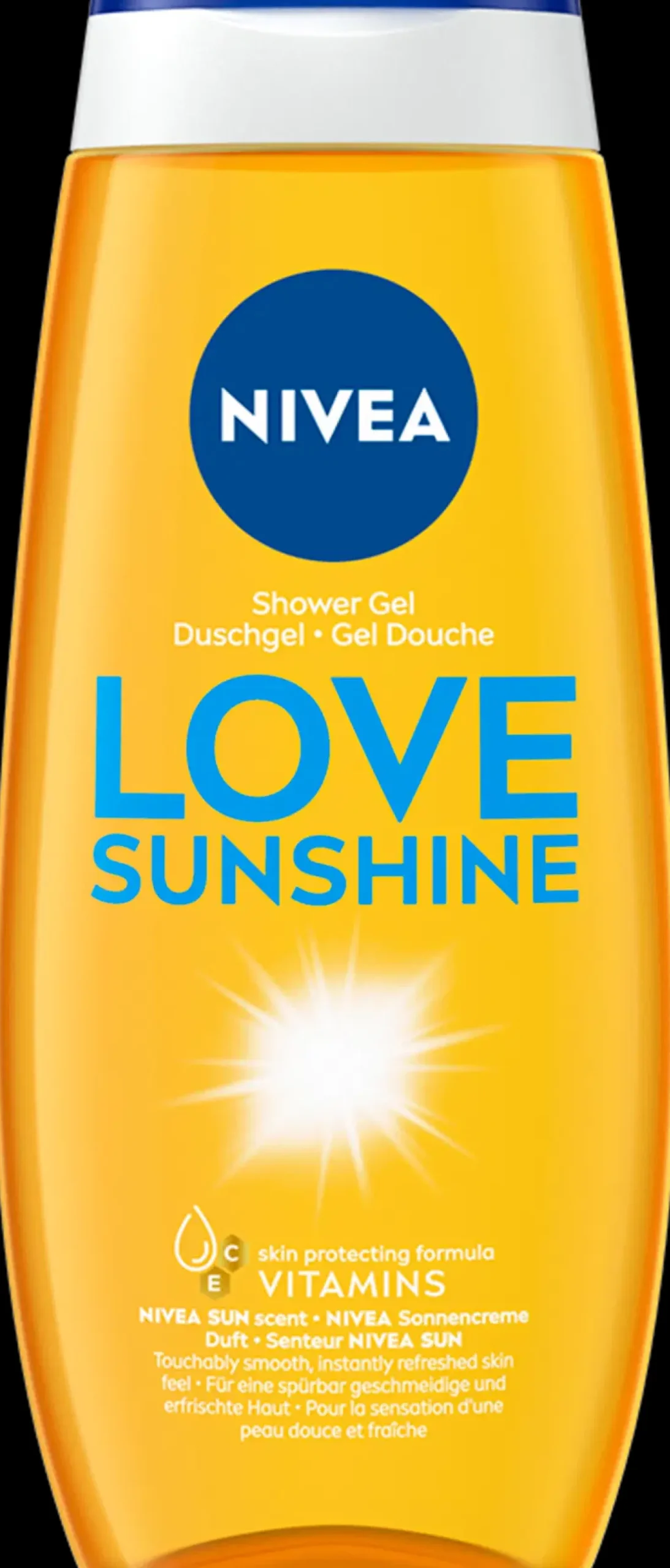 Ihanan aurinkoinen NIVEA Love Sunshine -suihkugeeli virkistää ja hoitaa ihoa välittömästi. C- ja E-vitamiinia sisältävä suihkugeeli puhdistaa hellävaraisesti jättäen ihon puhtaan tuntuiseksi ja terveen näköiseksi. Suihkugeelissä on virkistävä NIVEA SUN -tuoksu, ja se muuttaa jokapäiväisen suihkusi virkistäväksi elämykseksi. Koostumus suojaa ihoa kuivumiselta ja tekee siitä sileän. Dermatologisesti testattu, pH-arvoltaan iholle neutraali koostumus. Suihkugeeli ei sisällä mikromuoveja ja sen koostumus on 99% biohajoava ja pakkaus valmistettu 97% kierrätysmuovista.