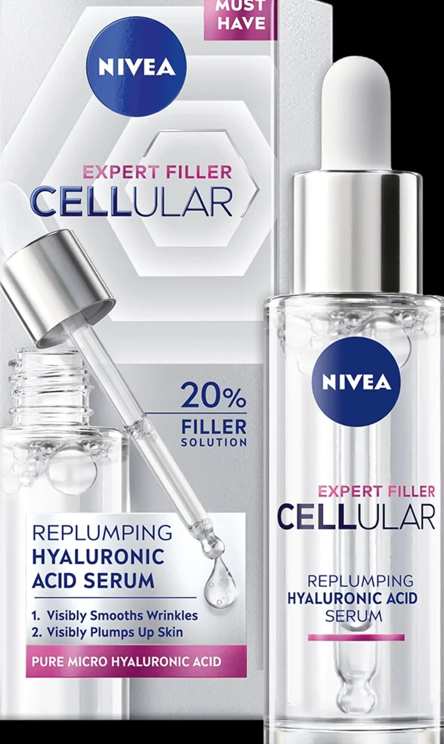 NIVEA Cellular Expert Filler Hyaluron Replumping -seerumi -kasvoseerumi on edistyksellinen anti-age-tuote, joka tekee ihosta kosteutetun, sileämmän ja nuoremman näköisen. Kevyt koostumus imeytyy välittömästi, eikä jätä rasvaista tunnetta iholle. Sisältää puhdasta mikrokokoista hyaluronihappoa. Hellävarainen iholle ja tehokas kaikille ihotyypeille, myös herkälle iholle.