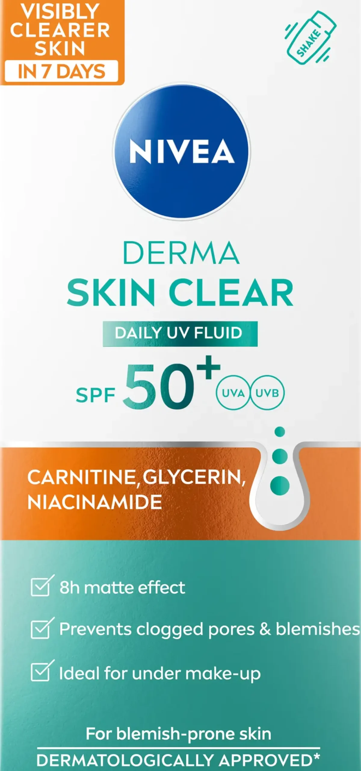 NIVEA Derma Skin Clear UV Daily Fluid SK50+ -päivävoiteemme sisältää suojakertoimen 50+, karnitiinia, glyceriiniä ja niasiiniamidia ja on erityisesti kehitetty epäpuhtauksiin taipuvaiselle iholle.