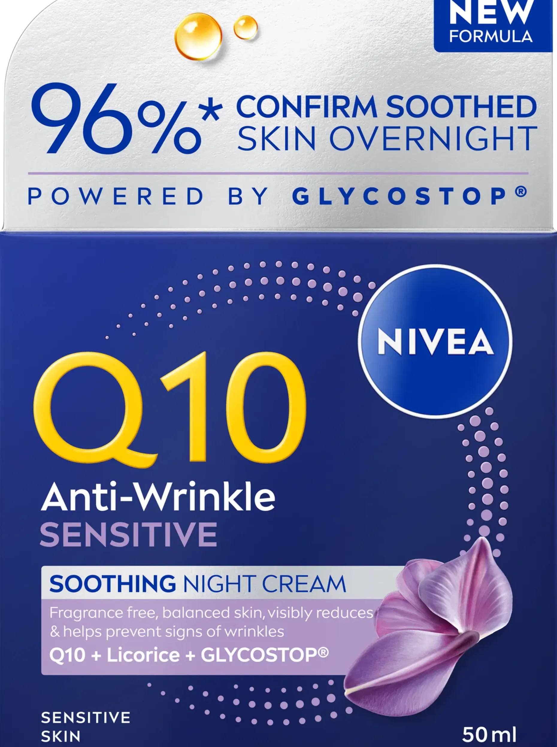 NIVEA Q10 Anti-Wrinkle Sensitive Soothing Night Cream -yövoide herkälle iholle. Hajusteeton ja rauhoittava koostumus sisältää: