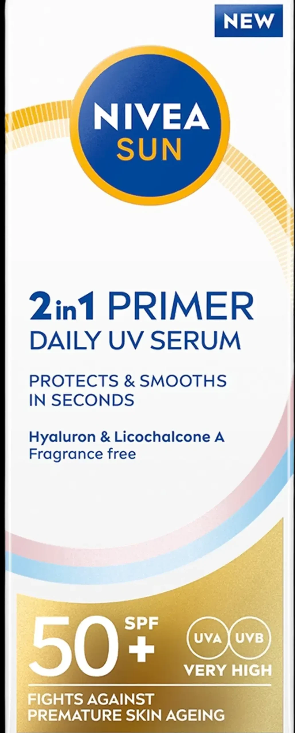 NIVEA SUN 2in1 Primer Daily UV Serum SK 50+ – kevyt aurinkosuojaseerumi yhdistää aurinkosuojan hyaluronihapon ja Licochalcone A:n kanssa, tehden ihosta terveen näköisen ja huomattavan pehmeän. Kehitetty erityisesti suojaamaan ja silottamaan kasvojen ihoa välittömästi. Innovatiivinen aurinkosuojaseerumi suojaa ihoa UVA/UVB-säteiltä ja sinivalon (HEV) vaikutuksilta, kuten ihon ennenaikaiselta vanhenemiselta. Koostumus sisältää kahta erityypistä hyaluronihappoa sekä Licochalcone A:ta, joka on voimakas antioksidantti. Pitkäketjuinen hyaluronihappo kosteuttaa ihon ylempiä kerroksia, kun taas lyhytketjuinen hyaluronihappo imeytyy syvemmälle ihoon ja stimuloi sen luonnollista hyaluronihapontuotantoa (in vitro). Lisäksi Licochalcone A aktivoi ihon omaa puolustusmekanismia ja suojaa ihosoluja oksidatiiviselta stressiltä. Kevyt, nopeasti imeytyvä seerumi ei jätä iholle tahmaista tunnetta tai valkoisia jäämiä. Tekee ihosta tasaisen ja huomattavan sileän, sopii erinomaisesti meikin alle. Ihanteellinen jokapäiväiseen käyttöön.