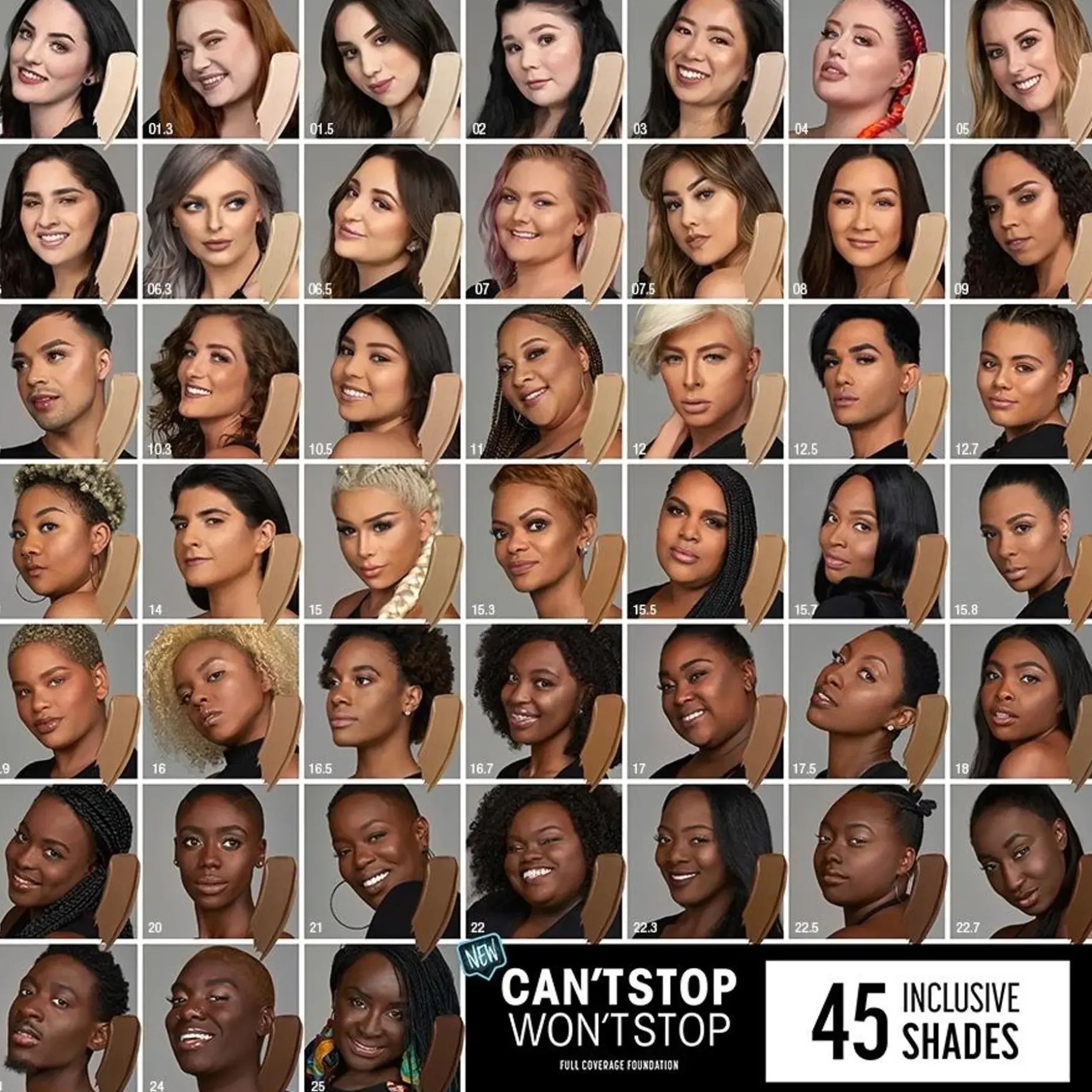 Can’t Stop Won’t Stop Full Coverage Foundation on täysin peittävä meikkivoide, jossa on yhtä isosti asennetta kuin sinussakin. Tämä miellyttävä nestemäinen koostumus on saatavilla 45 upeassa sävyssä, jotka pysyvät paikallaan. Täyteläiset sävyt levittyvät pehmeästi antaen mattalopputuloksen, joka kestää jopa 24 tunnin ajan. Meidän pieni ylisuorittajamme hillitsee myös ihon kiiltoa ja antaa mattapintaisen ihon koko päiväksi. Eikä siinä vielä kaikki! Tämä meikkivoide ei tuke ihohuokosia ja se sopii normaalille, rasvoittuvalle, herkälle ja sekaiholle.