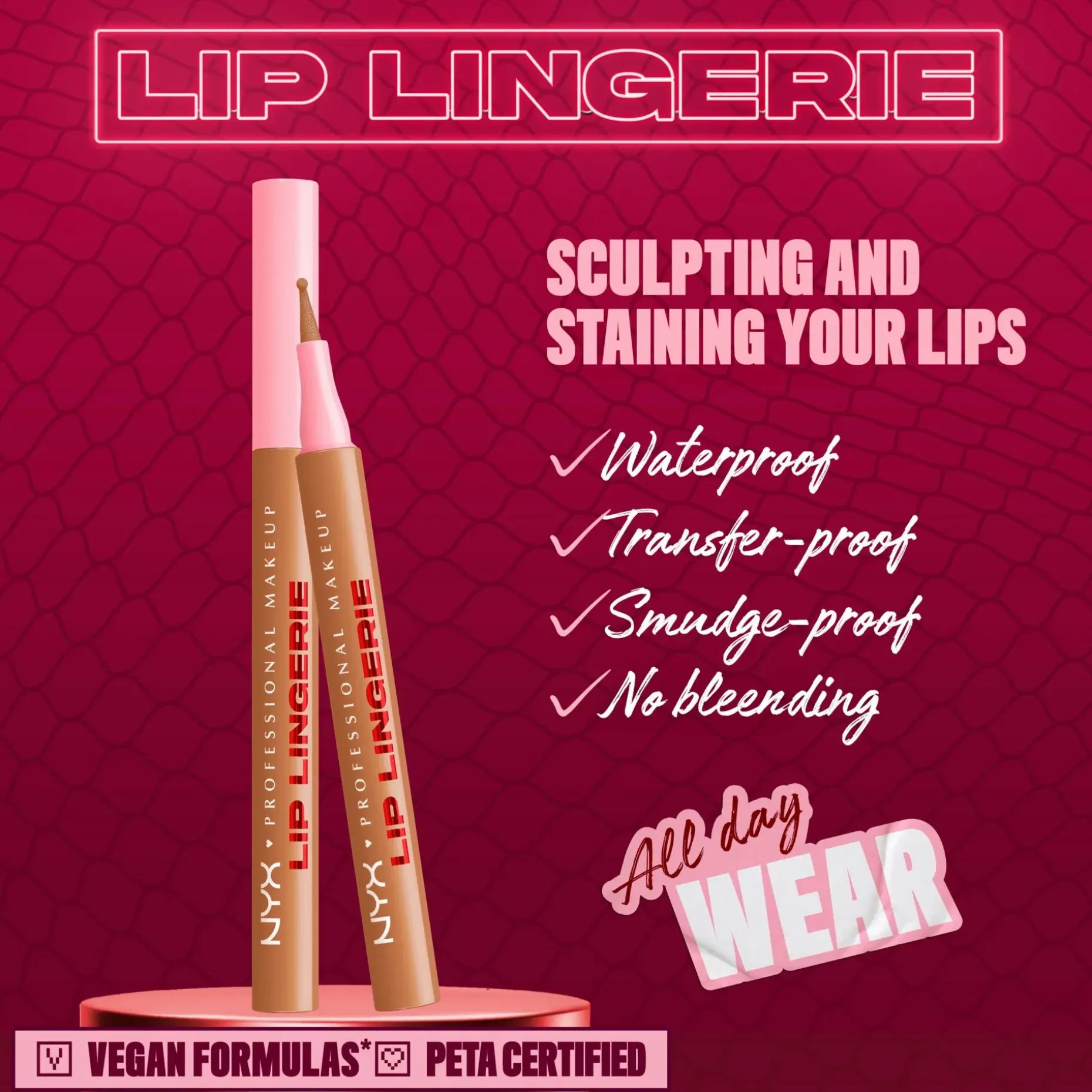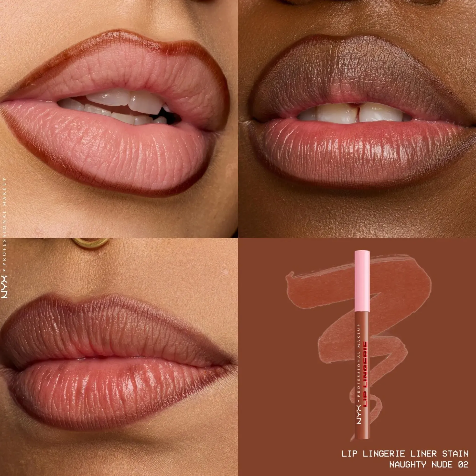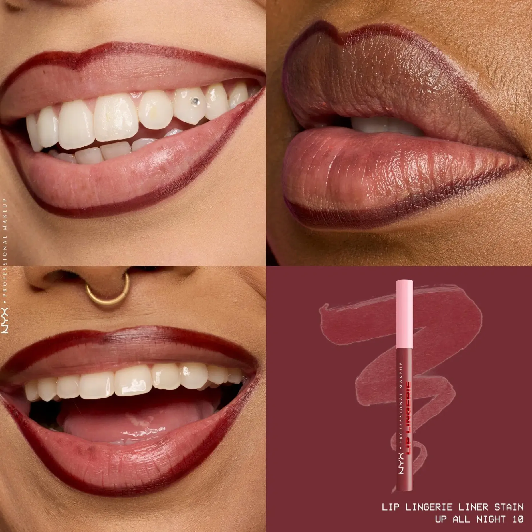 Väritä. Muotoile. Kohota. NYX Professional Makeup Lip Lingerie Liner Stain -huultenrajauskynä muotoiluun ja antamaan väriä huulille. Innovatiivinen nestemäinen huultenrajauskynä antaa koko päivän kestävän vedenkestävän värin, joka ei leviä tai tahraa. Monikäyttöinen pyöristetty huopakärkinen huultenrajauskynä myötäilee vaivattomasti ja tarkasti huulten kaaria. Luo kohottava vaikutelma muotoilemalla huulet tai väritä koko huules. Häivytä tarkat rajaukset, jotta rajausväri ei leviä. Koostumus sulaa huulille kuin silkki ja antaa pitkäkestoista määrittelyä. • Koko päivän kestävä lopputulos ei leviä • Tahraamaton ja vedenkestävä väri • Tarkka huopakärki • Kevyt ja miellyttävä nestemäinen koostumus • Ei leviä tai tahraa • Vegaaninen koostumus* *Ei sisällä eläinperäisiä ainesosia