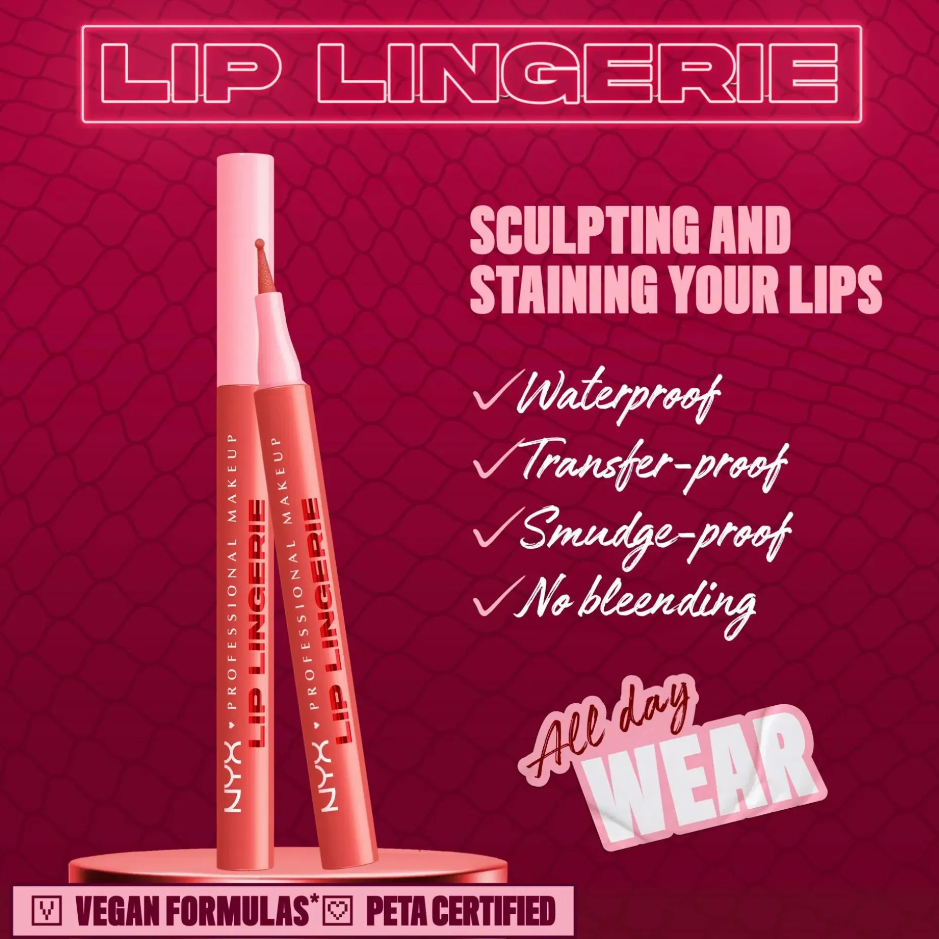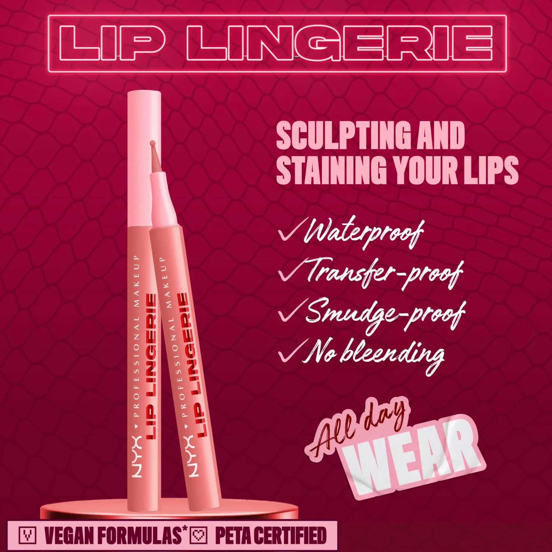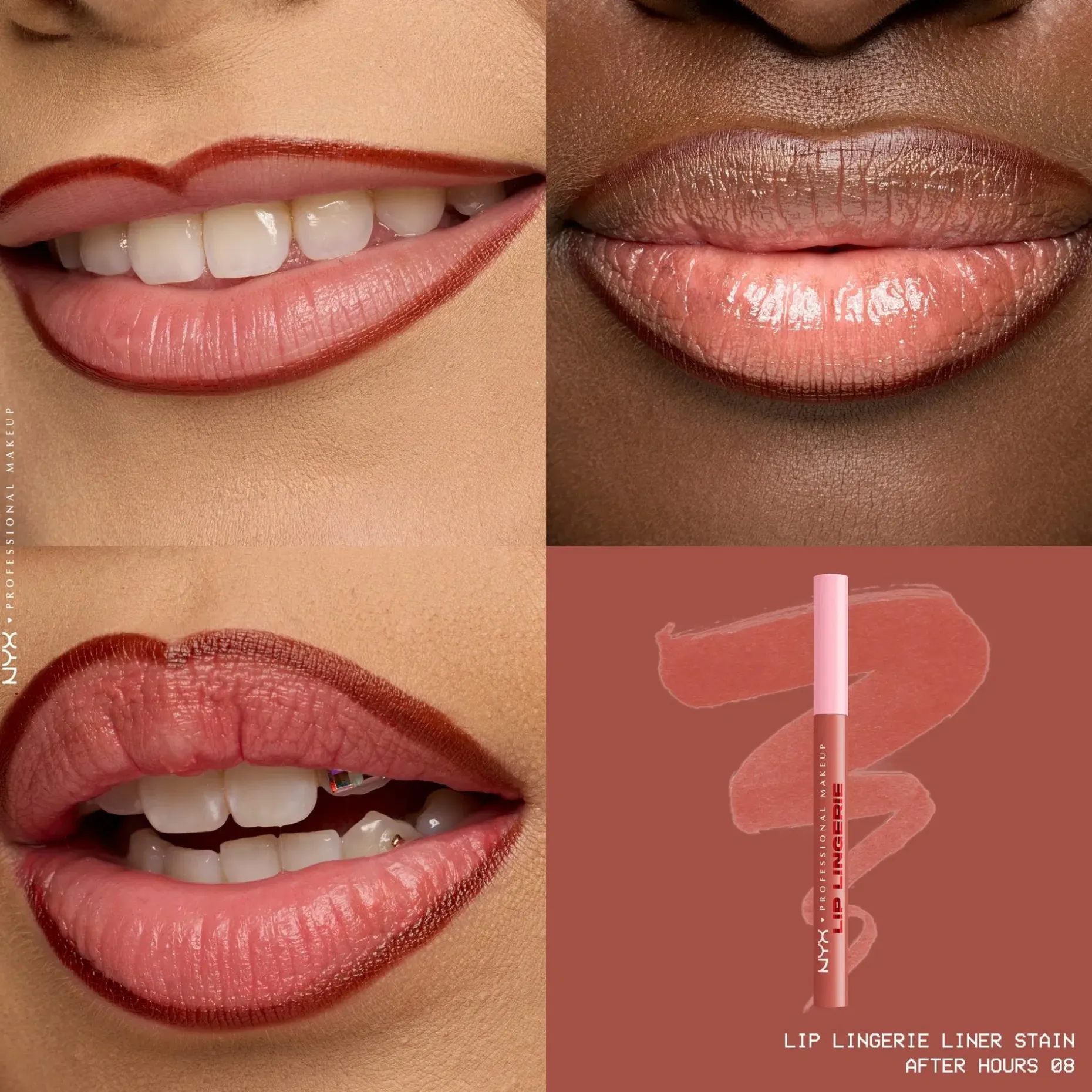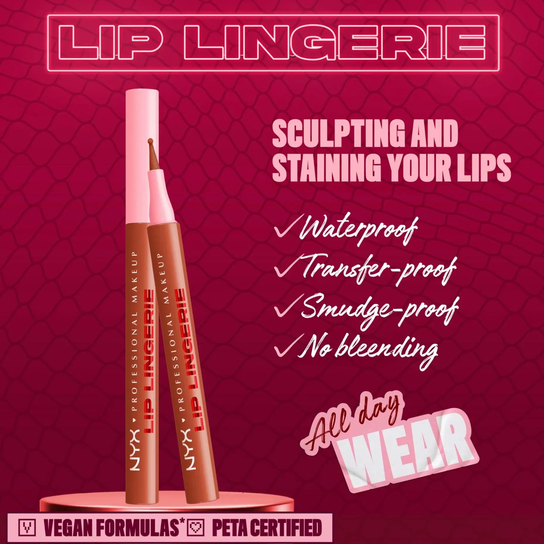 Väritä. Muotoile. Kohota. NYX Professional Makeup Lip Lingerie Liner Stain -huultenrajauskynä muotoiluun ja antamaan väriä huulille. Innovatiivinen nestemäinen huultenrajauskynä antaa koko päivän kestävän vedenkestävän värin, joka ei leviä tai tahraa. Monikäyttöinen pyöristetty huopakärkinen huultenrajauskynä myötäilee vaivattomasti ja tarkasti huulten kaaria. Luo kohottava vaikutelma muotoilemalla huulet tai väritä koko huules. Häivytä tarkat rajaukset, jotta rajausväri ei leviä. Koostumus sulaa huulille kuin silkki ja antaa pitkäkestoista määrittelyä. • Koko päivän kestävä lopputulos ei leviä • Tahraamaton ja vedenkestävä väri • Tarkka huopakärki • Kevyt ja miellyttävä nestemäinen koostumus • Ei leviä tai tahraa • Vegaaninen koostumus* *Ei sisällä eläinperäisiä ainesosia