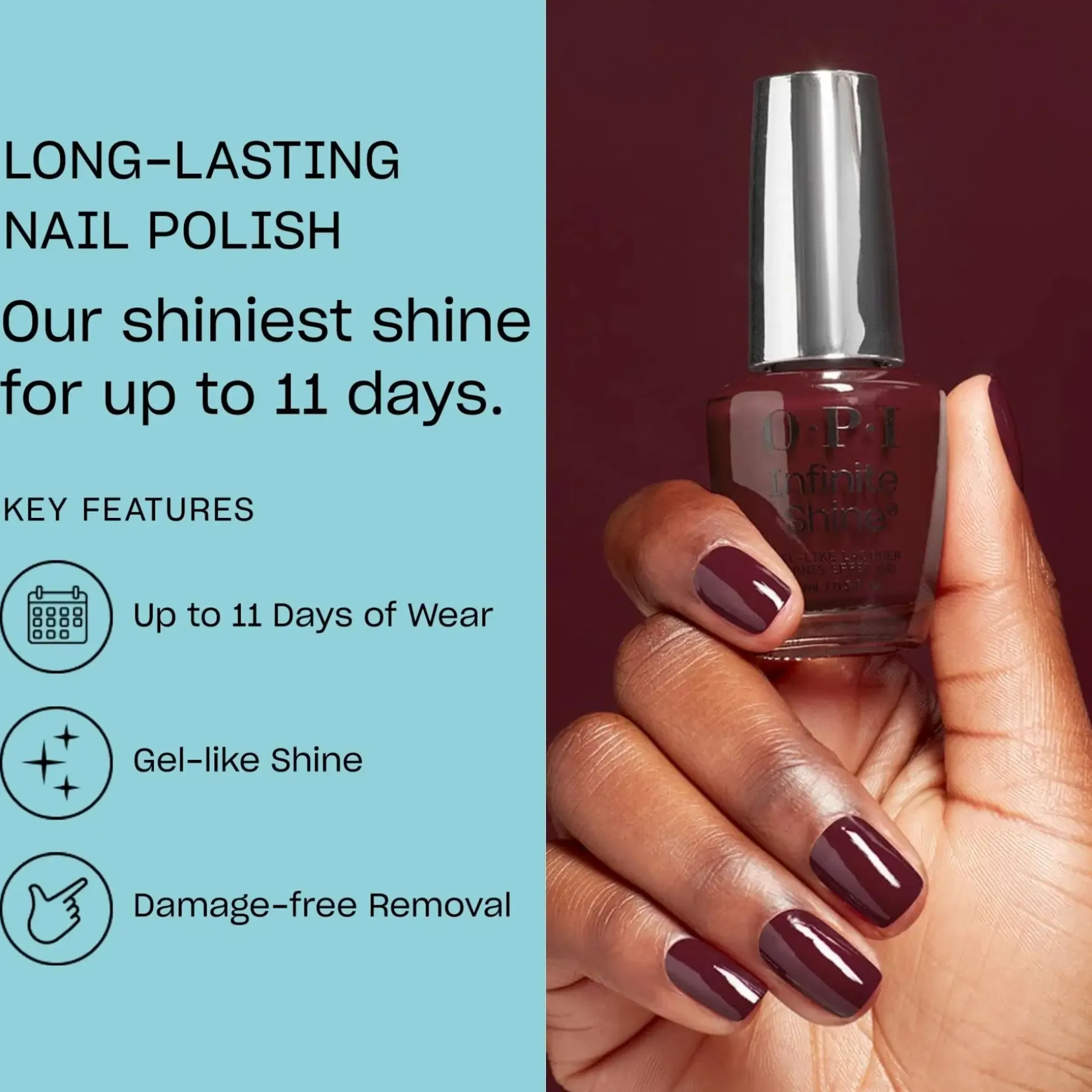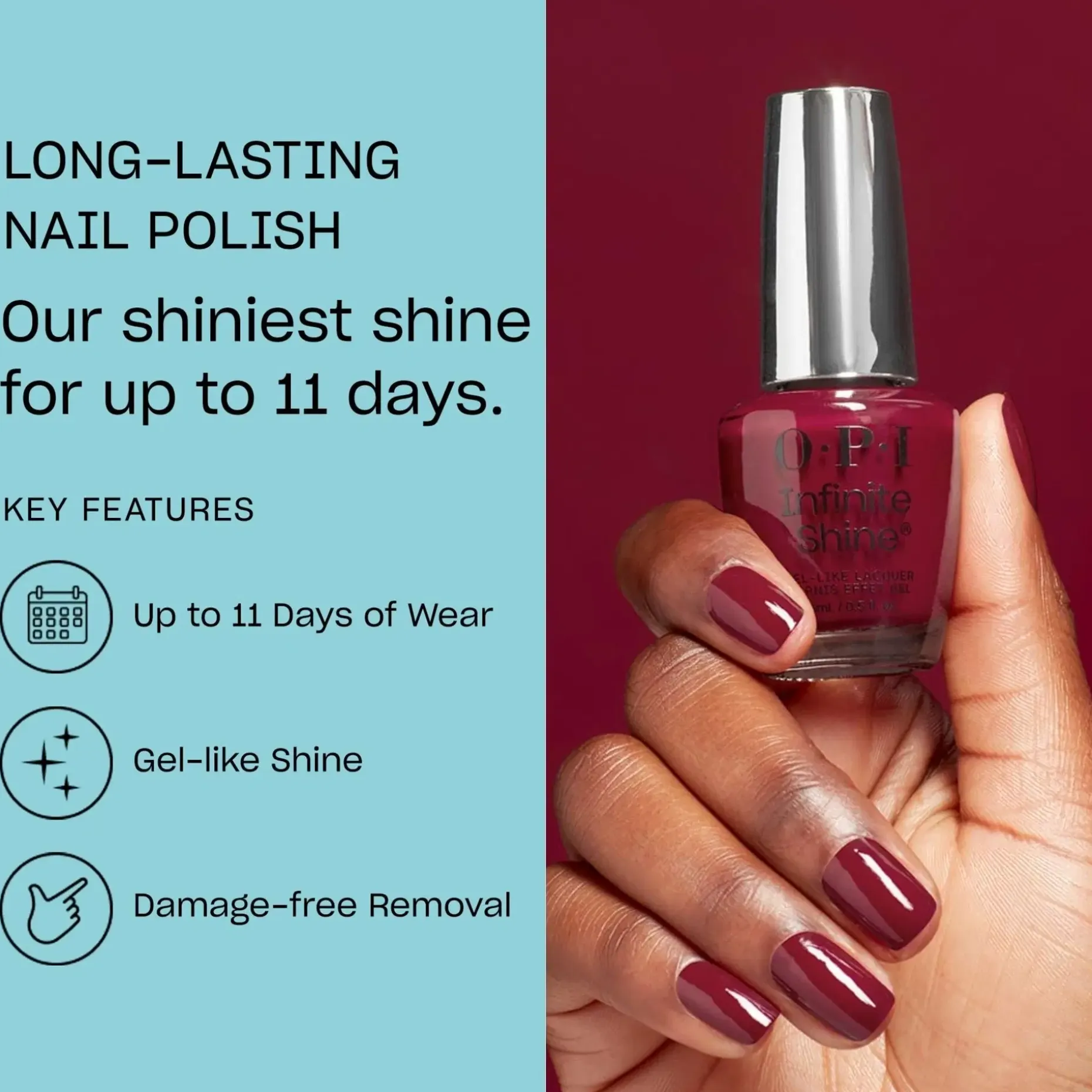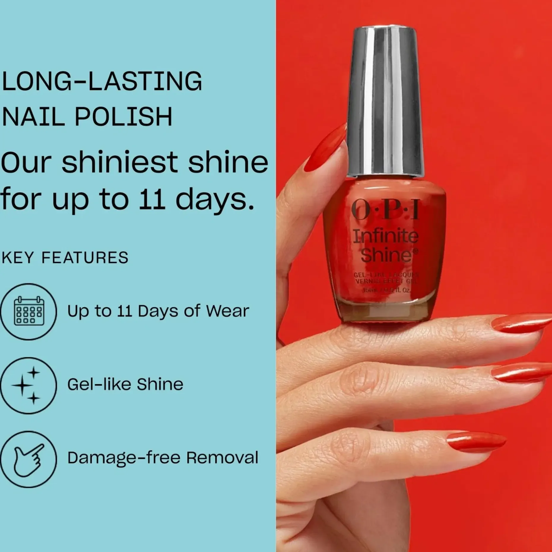 Locks like gel, unlocks like lacquer. OPI esittelee uuden mullistavan Infinite Shine -koostumuksen, jonka teknologia antaa kiiltoa, peittävyyttä ja pitkäaikaista kestoa jopa 11 päiväksi. Geelimäinen koostumus antaa sileän ja tasaisen peittävyyden ilman raitoja tai kuplia. Helppo poistaa asetonilla nopeasti ja vahingoittamatta kynttä. Niin hyvä, että sen luulisi olevan geelilakka. Infinite Shine yhdistää kaiken, mitä rakastat geeli- ja kynsilakassa.