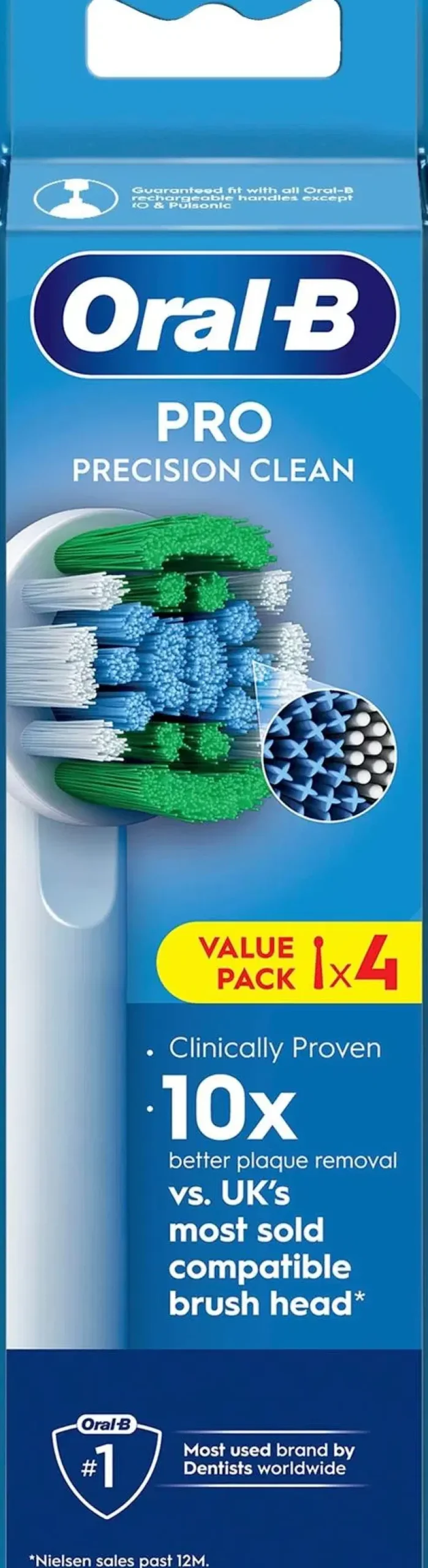 Oral-B Precision Clean -harjaspään harjakset poistavat plakkia hammas kerrallaan tarjoten ylivoimaisen puhdistuksen verrattuna tavalliseen käsikäyttöiseen hammasharjaan. Aidoissa Oral-B-harjaspäissä on uudet X:n muotoiset harjakset, jotka puhdistavat alueet, joihin pyöreät harjakset eivät yllä. Harjaspään kulumisen ilmaisin muuttaa harjakset vihreästä keltaiseksi, kun on aika vaihtaa harjaspää, mikä takaa aina 100 % puhdistustehon. Yhteensopiva ladattavien Oral-B-sähköhammasharjojen kanssa Pulsonic- & iO-sähköhammasharjoja lukuun ottamatta.