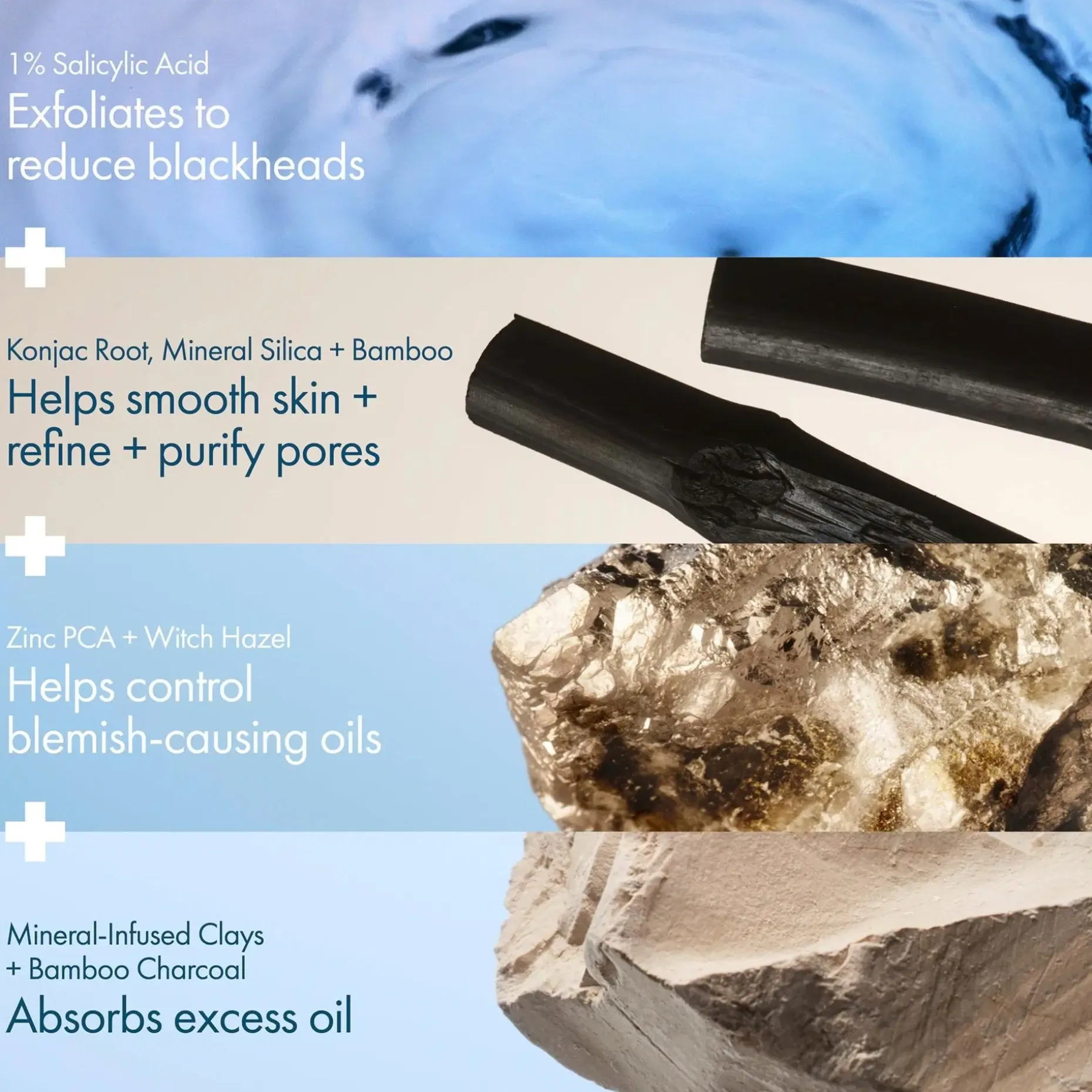 Tämä kuoriva naamio tarjoaa kaksinkertaisen kuorintamenetelmän mustapäihin kohdistuen ja ihon pintaa pehmentäen. Salisyylihappo kuorii ja vaikuttaa mustapäihin, kun taas luonnollisista aineosista peräisin olevat fyysiset kuorinta-aineet, kuten konjakjuuri, mineraalisilika ja bambu, auttavat tasoittamaan ihon rakennetta. Mineraalipitoisten savien ja bambuhiilen sekoitus imee ylimääräistä öljyä ja poistaa huokosia tukkivaa likaa.
