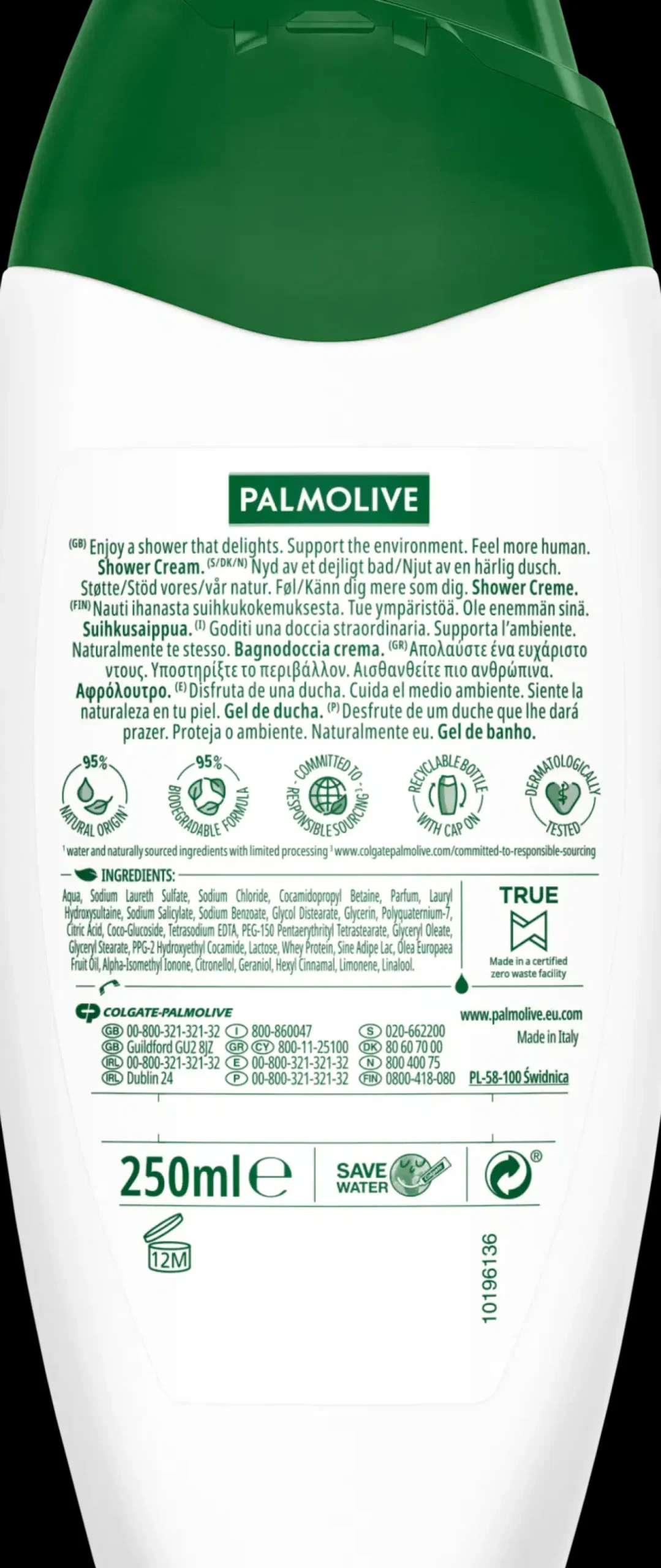 Vegaaninen Palmolive Naturals Olive & Milk -koostumus sisältää kasvipohjaista maitoa. Se on valmistettu 95% luonnollisista ainesosista** ja on 98% biohajoava. Kierrätettävä pullo ja korkki, sekä dermatologisesti testattu koostumus.