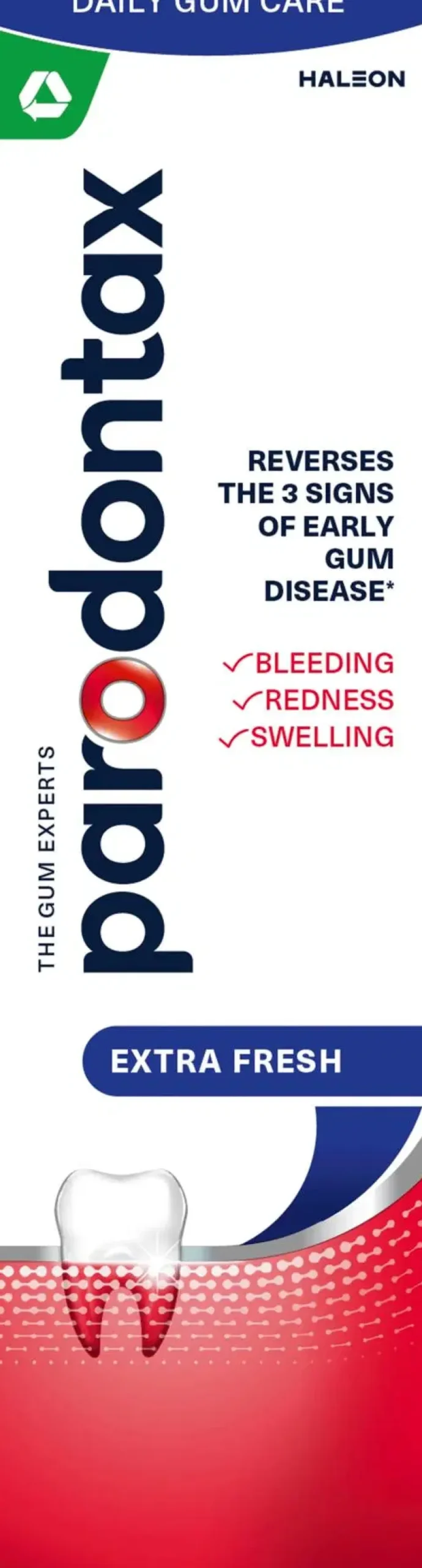 Lisäksi parodontax Extra Fresh -hammastahna jättää ikenet terveen tuntuiseksi ja suun raikkaan tuntuiseksi useiden tuntien ajaksi.