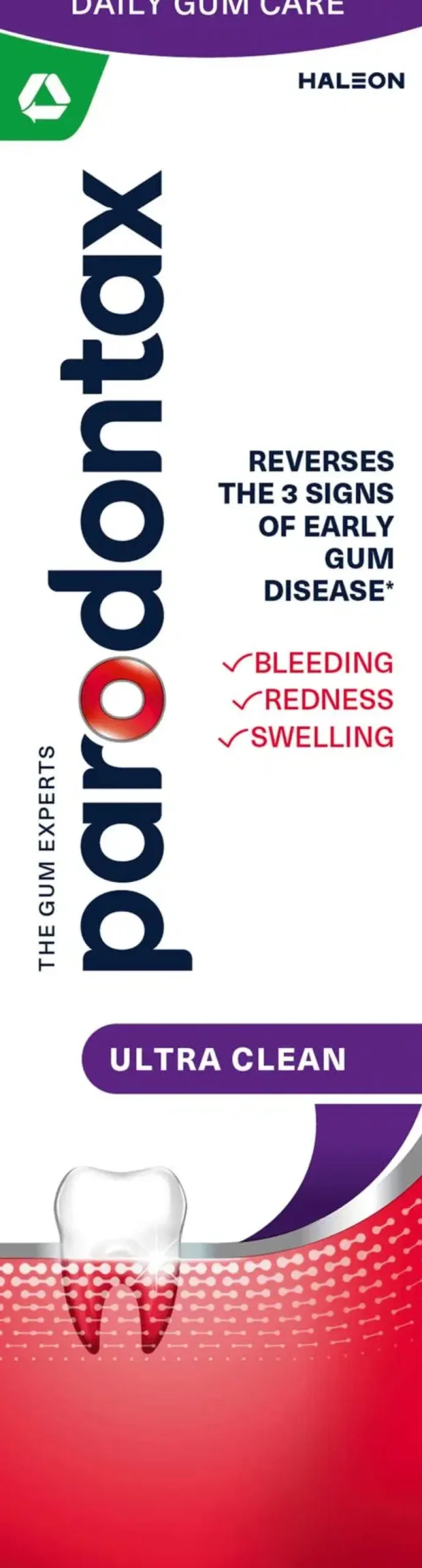 parodontax Ultra Clean on päivittäin käytettävä fluorihammastahna, joka auttaa pysäyttämään ja ehkäisemään ienten verenvuotoa kahdesti päivässä yhtäjaksoisesti käytettynä. Terveet ikenet eivät vuoda verta. Verenvuoto hampaiden harjauksen tai lankauksen yhteydessä voi olla merkki iensairaudesta. Hoitamattomana tilanne voi huonontaa suunterveyttä.Ienten verenvuoto voi johtua plakin kertymisestä ienrajaan.