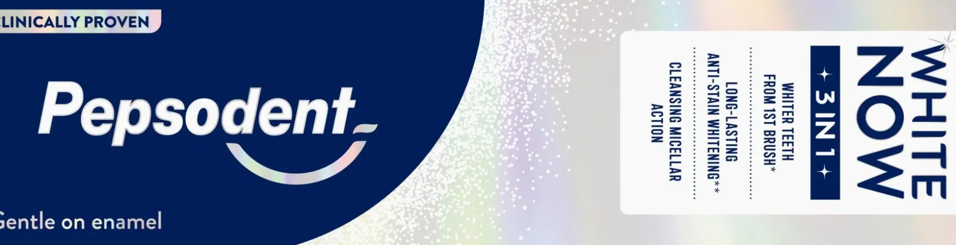 Pepsodent White Now 3in1 hammastahna sisältää 96 % luonnollista alkuperää olevia ainesosia ja sen on kliinisesti todistettu olevan hellävarainen kiilteelle, samalla kun se tekee hampaista valkoisemmat. Samasta sarjasta löydät myös Pepsodent White Now Hello Glow -hammastahnan, joka tekee hampaistasi ihanan puhtaat ja valkoisemmat.
