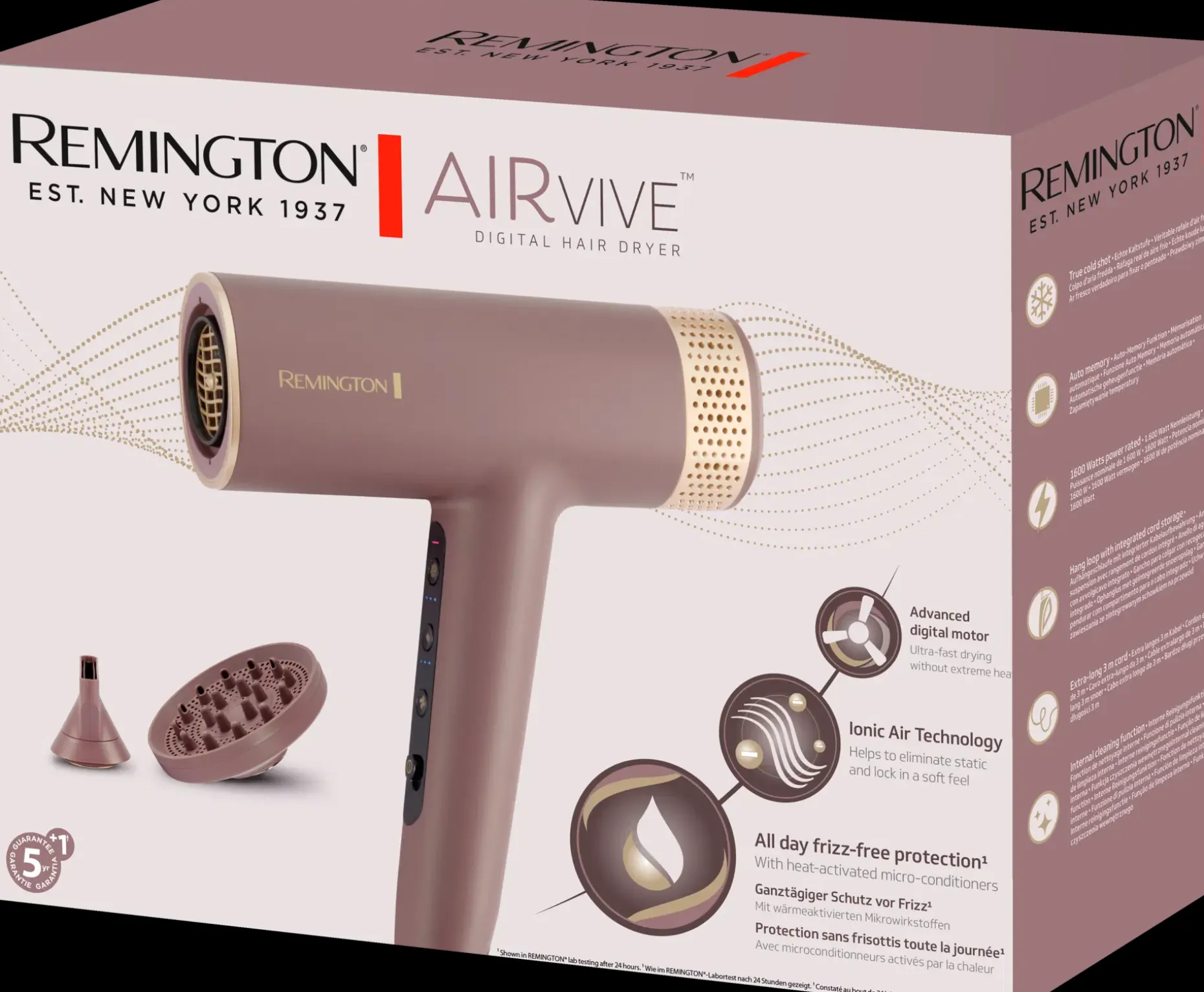 REMINGTON® AIRvive™ digitaalinen hiustenkuivain ehkäisee pörröisyyttä ja tekee hiuksista pehmeät. Sähköisyyttä poistava Ionic Air teknologia kuivaa hiukset nopeasti ilman liiallista kuumuutta ja vapauttaa samalla lämmön vaikutuksesta aktivoituvia hoitavia mikroainesosia, jotka ehkäisevät pörröisyyttä koko päivän ajan. Digitaalisesti ohjattu edistyksellinen BLDC-moottori pyörii viisi kertaa tavanomaista nopeammin, minkä ansiosta pitkät ja paksutkin hiukset kuivuvat nopeasti. Nopeudesta huolimatta kuivaus on erityisen hellävarainen. Hiuksia suojaava lämpöanturi säätelee puhallusilman lämpötilaa liiallisen kuumuuden välttämiseksi. Hiuspohjalle hellävarainen Comfort+™-asetus ehkäisee epämiellyttävää lämpökuormitusta kuivaamisen aikana.