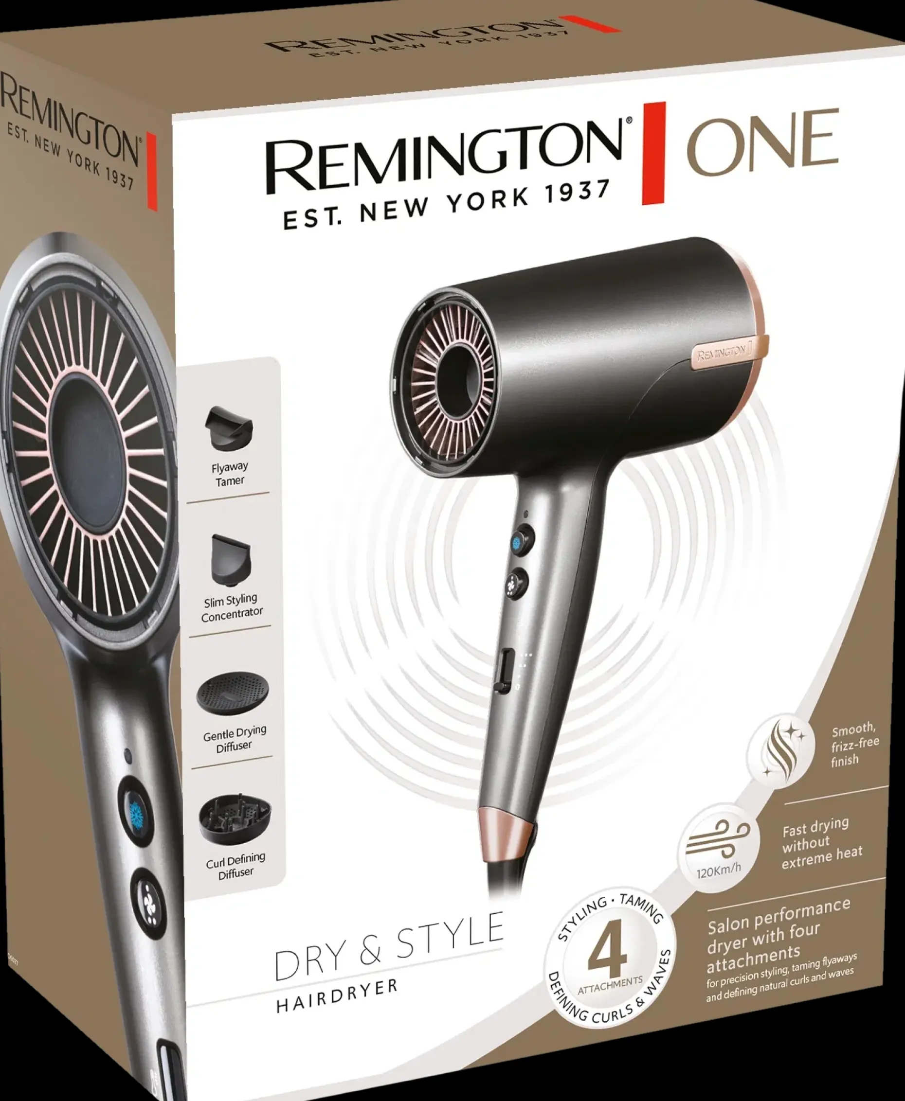 Remington ONE Dry and Style -hiustenkuivaaja auttaa sinua saavuttamaan haluamasi tyylin neljällä lisäosalla, jotka on suunniteltu taltuttamaan irtohiuksia, silottamaan pörröisyyttä, erottelemaan kiharoita luonnollisesti ja nopeuttamaan kuivausaikaa.