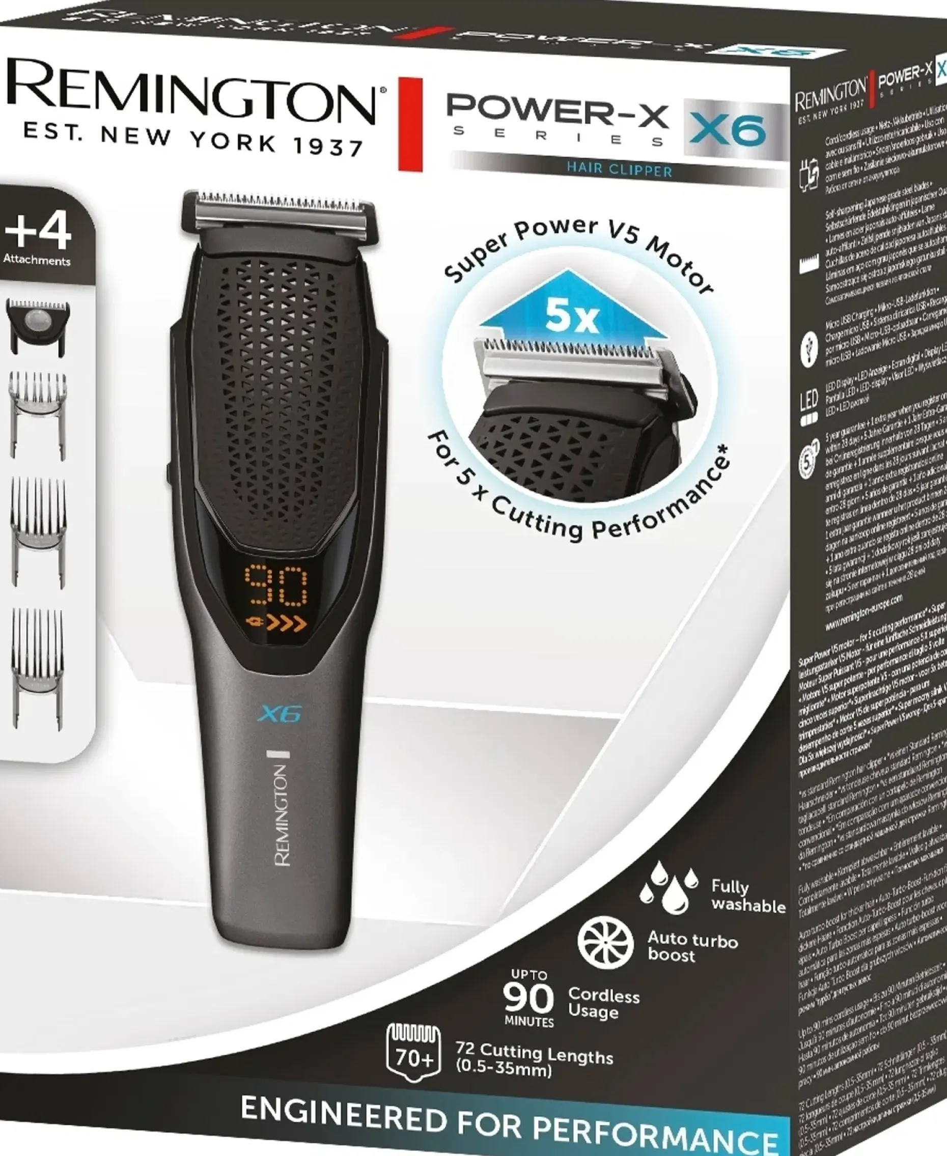 Huippulaadukkaat japanilaiset itseteroittuvat terästerät leikkaavat tarkasti jokaisella käyttökerralla. Terät on helppo irrottaa ja huuhdella käytön jälkeen. Näin hiustenleikkurisi pysyy huippukunnossa ja valmiina seuraavaa käyttökertaa varten. Power Series X6-hiustenleikkuri on ergonomisesti muotoiltu, ja sen anti-slip-pinnoite takaa, että leikkuri pysyy täydellisesti hallinnassa ja istuu hyvin käteen. Laite ei myöskään luista kädessä, vaan se pysyy myös kosteana tukevasti otteessa. V5-moottorin ansiosta hiustenleikkurilla on viisinkertainen suorituskyky tavalliseen hiustenleikkuriin verrattuna. Auto Turbo Boost- toiminto tunnistaa automaattisesti, milloin terät tarvitsevat lisää tehoja, esimerkiksi erityisen paksuja ja karkeita hiuksia leikatessa. Akun täyteen lataaminen USB-laturilla kestää vain 1 tunnin! Yhdellä latauksella saa jopa 90 minuuttia ajoaikaa. Led merkkivalo ilmaisee akun varauksen tason. Voit käyttää hiustenleikkuria myös verkkovirtaan kytkettynä. Harmaa, musta ja turkoosi väritys antaa leikkurille trendikkään ilmeen.