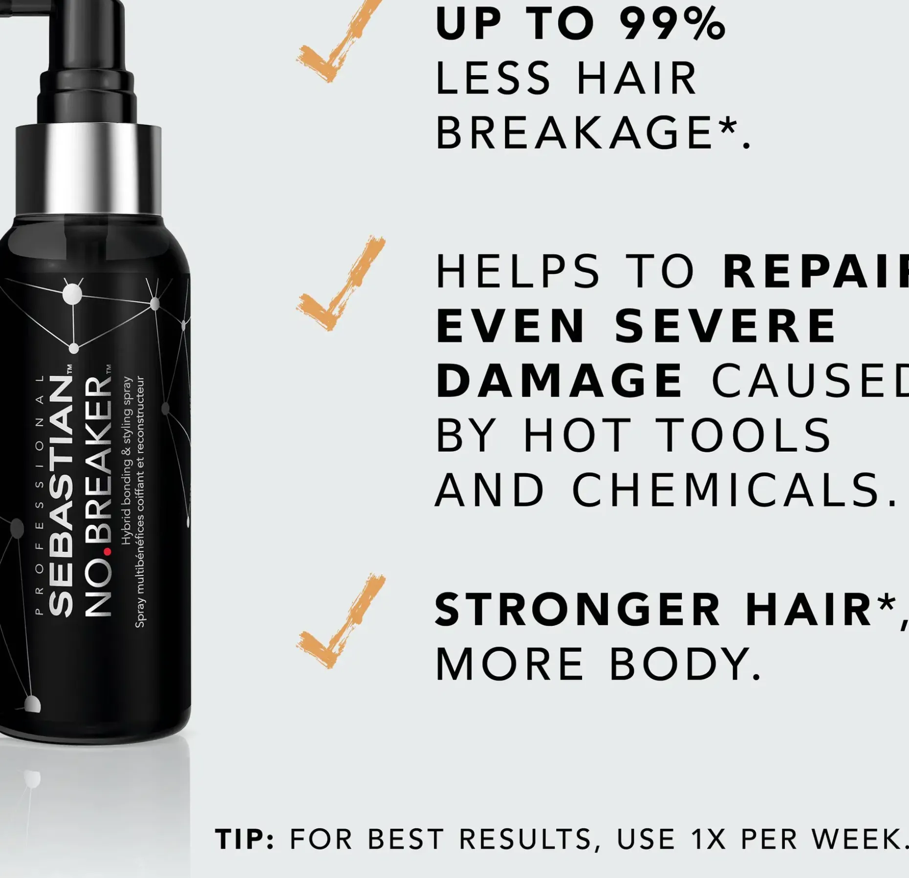 Sebastian Professional No.Breaker on hybridimuotoilusuihke, joka sopii kaikille hiustyypeille. Tämä hiusten katkeilua ehkäisevä seerumi on kehitetty niille, jotka rakastavat kokeilla hiuksiaan, mutta ovat kokeneet rakennevaurioita kuumien työkalujen ja kemikaalien käytöstä. No.Breaker sisältää 87 % luonnollista alkuperää olevia ainesosia, jotka tunkeutuvat syvälle hiuksen suomukerrokseen ja luovat uusia hiussidoksia hiuskuituun tuuheudesta tinkimättä. No.Breaker-suihke takaa jopa 99 % vähemmän katkeilua* ja antaa hiuksille jopa 4 viikon pehmeyden. Saat parhaan tuloksen käyttämällä tuotetta yhdessä No.Breaker Bonding Pre-Shampoon, No.Breaker Bonding Shampoon, No.Breaker Melting Hair Mask -hiusnaamion ja No.Breaker Leave-in Cream -suihkeen kanssa.