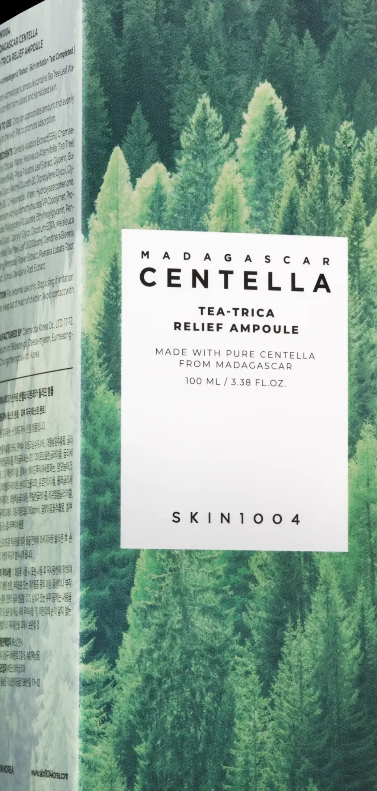 SKIN1004 Centella Tea-Trica Relief Ampoule on SOS apukeino iholle, jolla on näppyä ja tulehdusta. Teepuuöljyä ja rohtosammakonputkiuutetta sisältämä koostumus rauhoittaa ihoa tehokkaasti ja auttaa sitä palautumaan tulehduksen jälkeen.