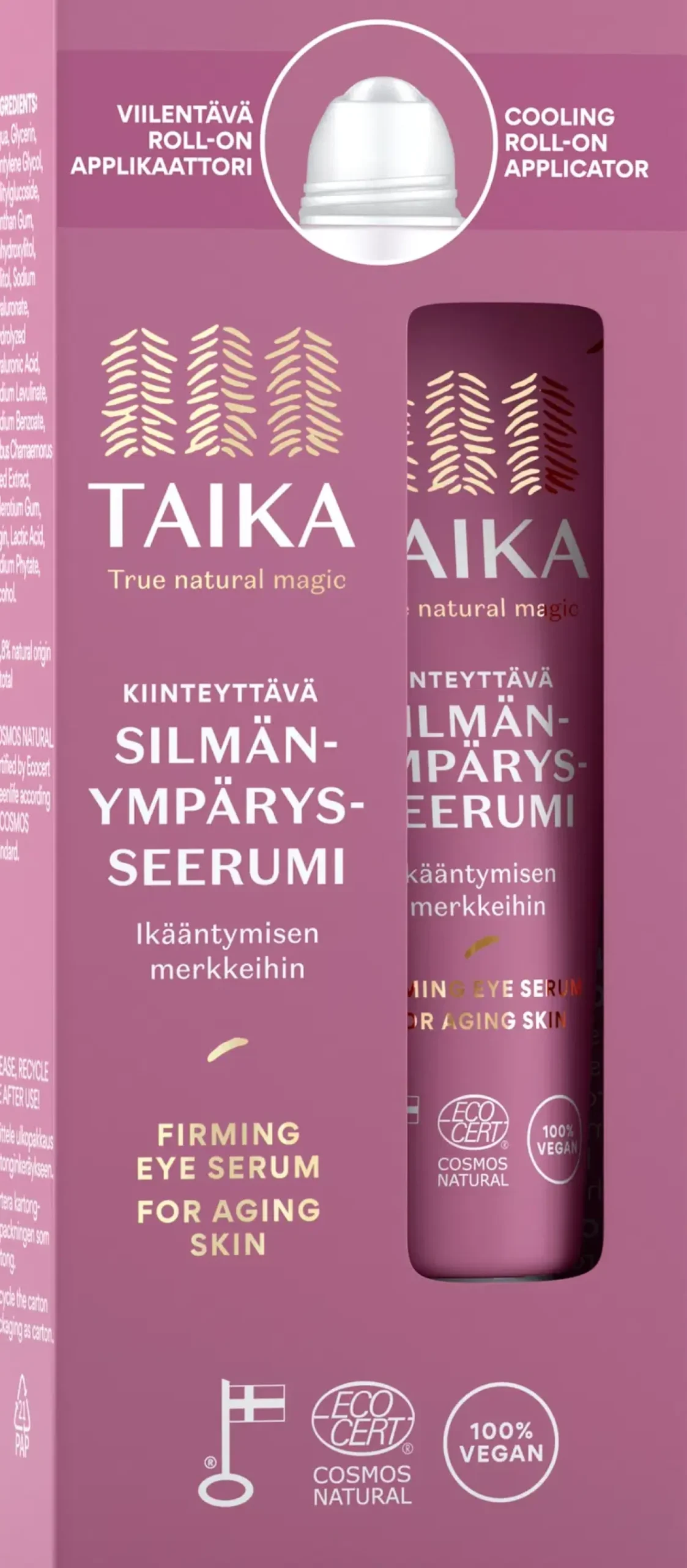 Taika Kiinteyttävä Silmänympärysseerumi tuo välitöntä kosteutusta ja hehkua silmänympärysiholle. Hyaluronihappo kosteuttaa ja silottaa juonteita heti, samalla vahvistaen ihon luonnollista suojakerrosta. Ksylitolin ja glyseriinin yhdistelmä auttaa ylläpitämään ihon kosteustasapainoa pidempään, ja lakan siemenuute parantaa ihon kimmoisuutta. Viilentävä roll-on -applikaattori virkistää ja rentouttaa silmänympärysihoa. Säilytä tuote jääkaapissa saadaksesi extra viilennystä ja virkistystä, erityisesti aamulla!