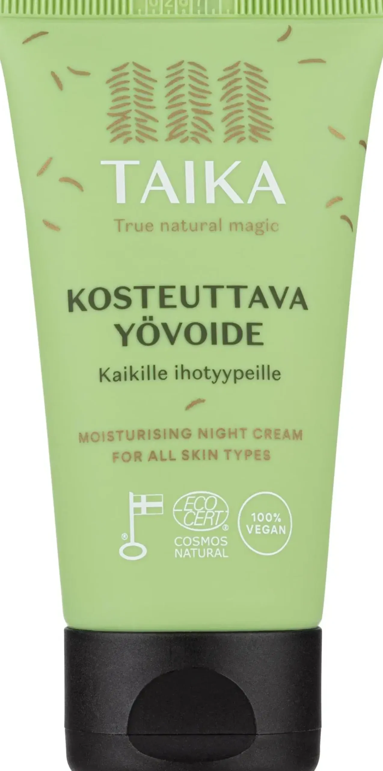 Taika Kosteuttava yövoide sisältää koivunmahlaa ja ksylitolia, jotka kosteuttavat, rauhoittavat ja tasapainottavat ihoa yön aikana. Kevyt ja nopeasti imeytyvä voide jättää ihon pehmeäksi ja kimmoisaksi ilman tahmaista tunnetta. Sheavoi ja kasviöljyt ravitsevat ja ehkäisevät ihon kuivumista. Tämä yövoide sopii täydellisesti kaikenikäisille ja kaikille ihotyypeille, erityisesti normaalille, rasvaiselle ja sekaiholle. Vegaaninen, Ecocert Cosmos Natural -sertifioitu luonnonkosmetiikkatuote. Valmistettu Suomessa.