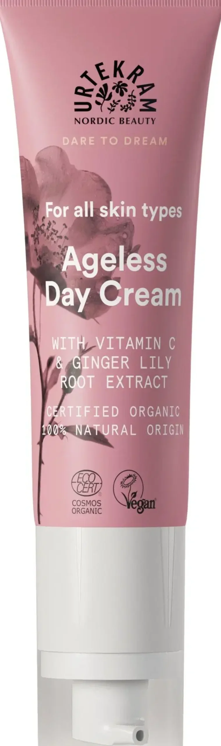 Urtekram Ageless päivävoide auttaa ihoa suojautumaan ikääntymisen ensimerkeiltä. Antioksidantteja ja C-vitamiinia sisältävä luonnollinen, kosteuttava ja ravitseva anti-age päivävoide sisältää mm. ruusunmarjaöljyä ja valkoisen inkiväärililjan juuriuutetta, jotka auttavat ihoa suojautumaan vapailta radikaaleilta ja ympäristön vaikutuksilta. Hyaluronihappo auttaa säilyttämään ihon kimmoisuuden ja vähentämään juonteita ja aloe vera, jojoba- sekä manteliöljy auttavat ihoa pysymään kosteutettuna koko päivän. Antaa iholle uutta energiaa ja raikasta hehkua. Sopii kaikille ihotyypeille. Luomusertifioitu Ecocert Cosmos Organic -standardin mukaisesti, vegaaninen ja 100 % luonnollista alkuperää oleva koostumus.