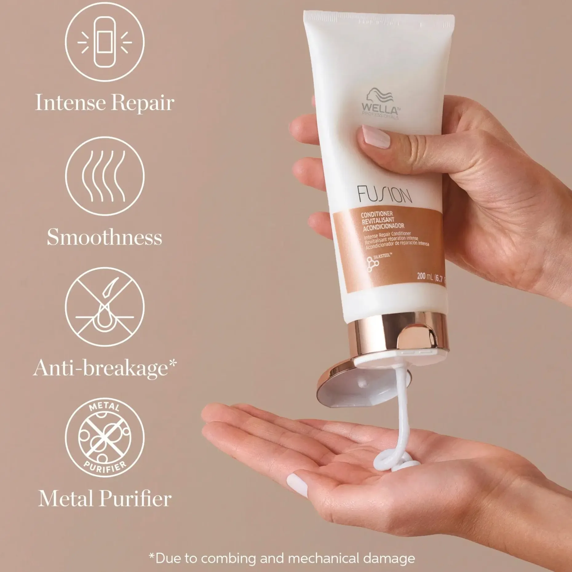Wella Professionals Fusion Intense Repair Conditioner on kehitetty erityisesti vaurioituneille hiuksille. Hoitoaine sisältää silkkiaminohappoja, jotka suojaavat hiuksia mekaanisilta vaurioilta ja tekevät niistä vastustuskykyisemmät. Sopii myös vaalennetuille tai kemiallisesti käsitellyille hiuksille. Saatavana kolme kokoa: 30 ml, 200 ml ja 1000 ml.
